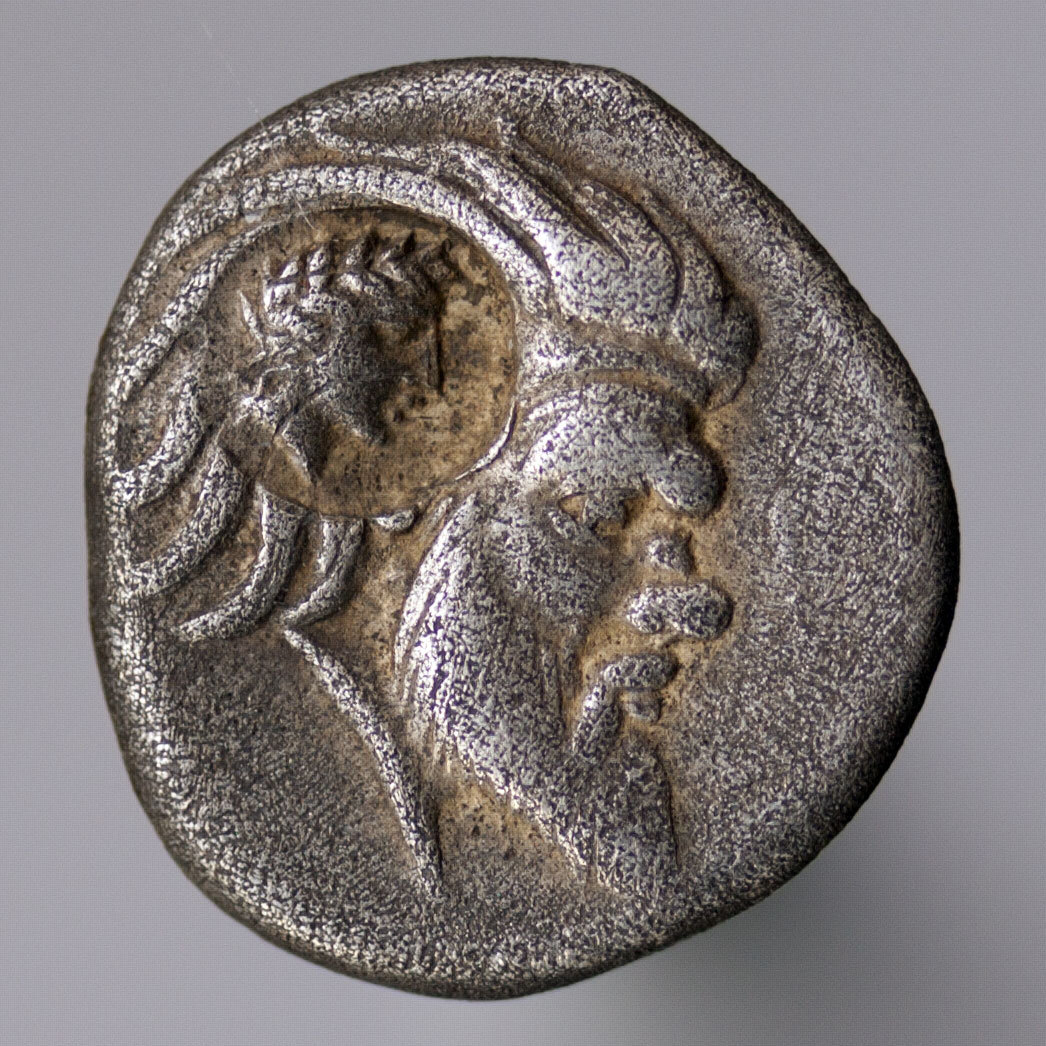 Гемидрахма боспорского царя Левкона I 379-369 года до нашей эры. Материал - серебро, 2.5 грамма. Голова бородатого сатира с надчеканом храма Апполона.