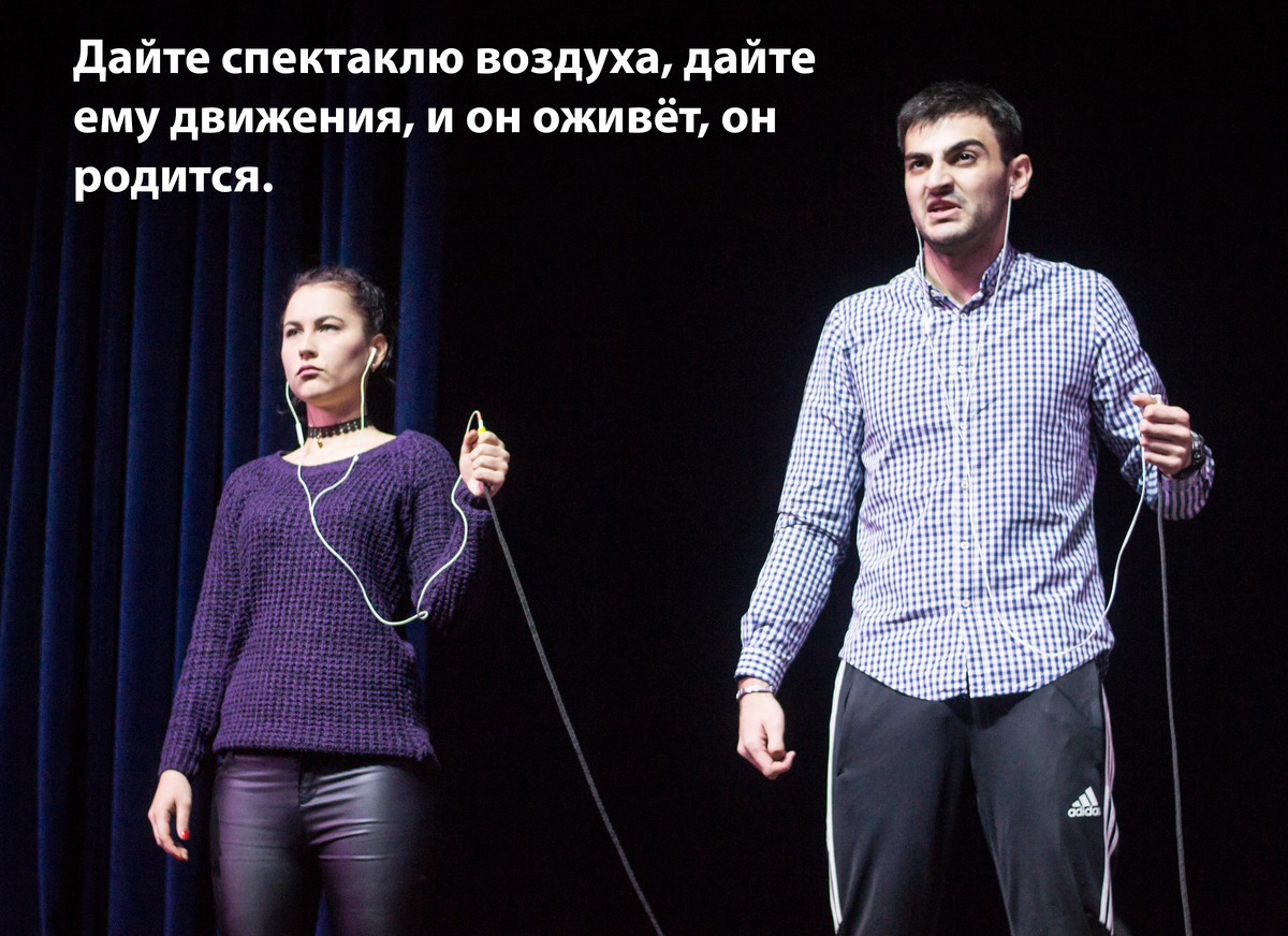 Таким образом, лучше пусть сыроватая сцена дозреет в прогонах (и это более правильно, ибо на прогонах актёры подхватят нужный темпо-ритм всего спектакля, распределят свои силы по продолжительности и сумеют сыграть то, что на репетициях не давалось), чем пересушенная… вообще дойдёт до прогона. Актёры – это живые люди, обладающие человеческим фактором. Как бы ты их не дрессировал на репетициях, на показе всё равно что-то может пойти не так. Это в равной степени относится и к актёрам-любителям, и к актёрам-профессионалам. Дайте спектаклю воздуха, дайте ему движения, и он оживёт, он родится. Движение – это жизнь. И на это мы – режиссёры, педагоги, руководители коллективов – можем влиять напрямую.