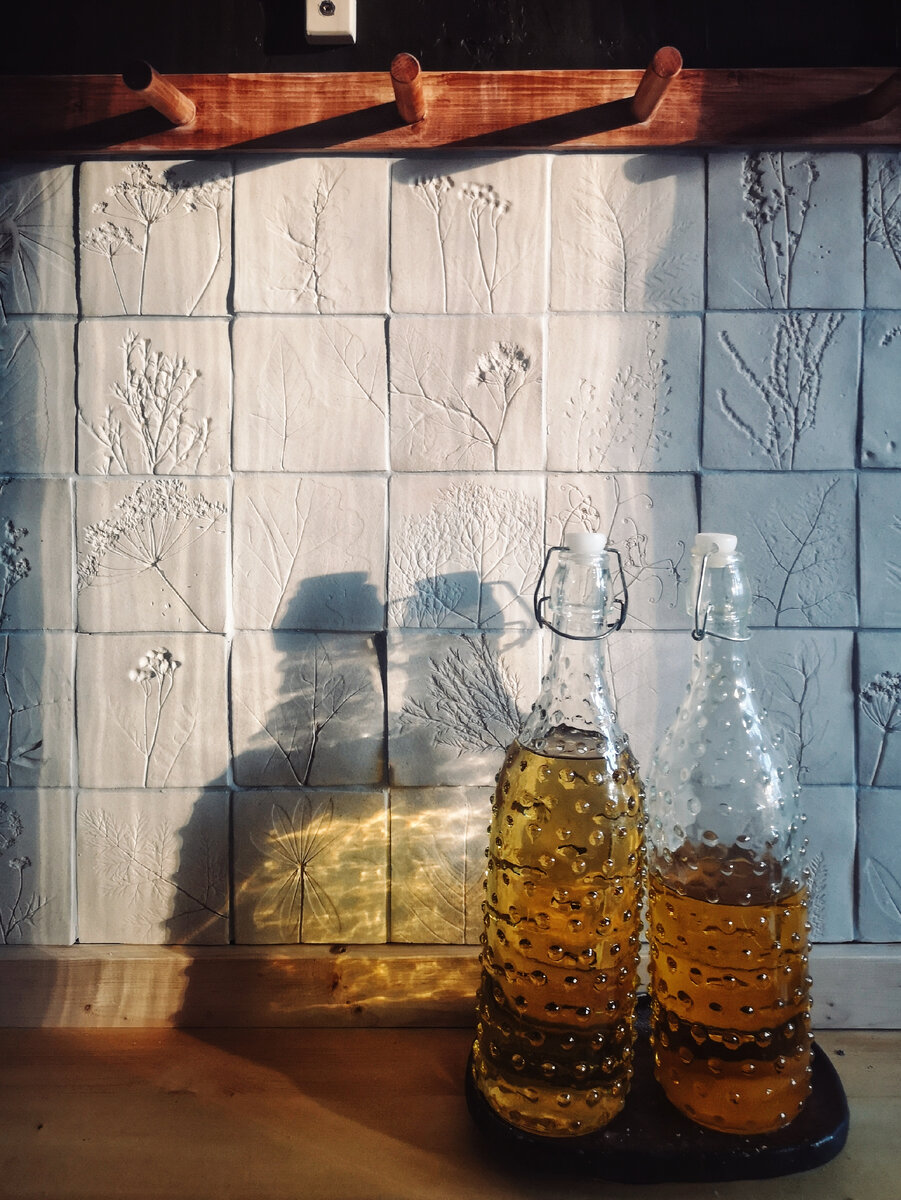 С начала изготовления первой плитки до укладки фартука прошло три месяца. 145 плиток с отпечатками 145 растений и одной Кисины. Я очень рада, что не нашла нужную мне готовую плитку в магазинах, ведь сейчас у меня на кухне не просто красивый фартук, а память об этом лете. Здесь отпечатки маленького ещё дуба, что растёт у нашего дома. Отпечатки усиков впервые посаженного мной гороха, семена которого мне привезла мама. Это самый сладкий сорт гороха, что мне доводилось пробовать. Отпечатки сорго веничного, который я привезла от бабушки. Она посадила семена из обычного веника, и они выросли у неё огромными двухметровыми метёлками. Здесь отпечатки всех моих дачных сорняков, с которыми я безуспешно боролась всё лето. Колосков, за которыми мы специально ходили с мужем на пыльную трассу за городом. След Кисины, прыгнувшей на первую же слепленную плитку. Общий размер фартука: 299 см * 52,5 см. Размер шаблона для плитки - 11*11 см., после высыхания и двух обжигов плитки усели до 10 см. +/- 2