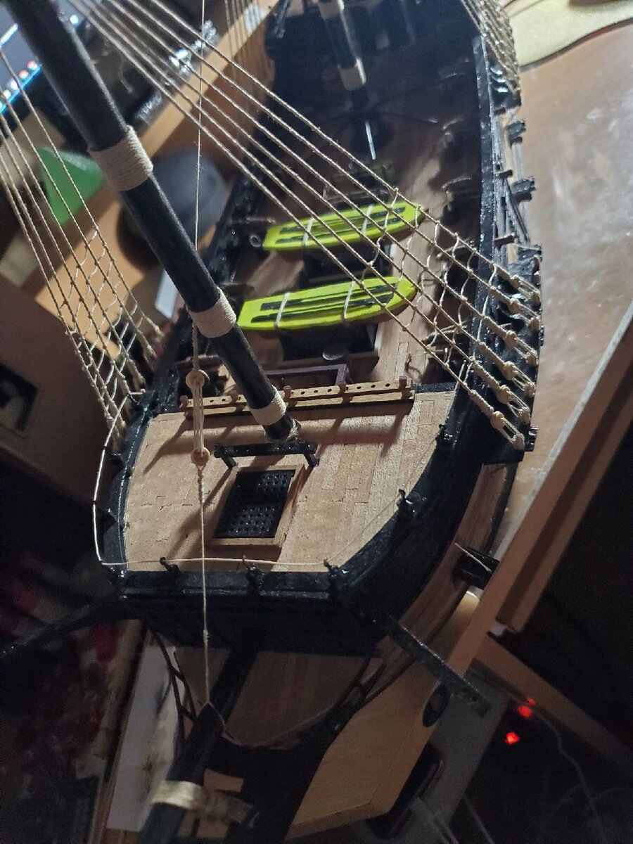 На данный момент сборка осуществляется на уровне канатных лестниц Уже начал ставить узлы канатных лестниц Фок мачта с самой верхушки установил канаты, на них тоже будут выбленки Гнездо на фок мачте тоже подготовлено, юферса присоединил и приклеил, в дальнейшем юферса и канаты будут окрашены черной краской Так выглядит на данный момент На грот мачту присоединил юферса для соединения грот и бизань мачты С каждым днем продолжаю работу и учусь на ошибках Если понравилась сборка ставь лайк и подписывайся! Дальше больше!