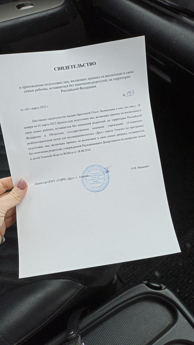 Получила свидетельство об окончании Школы приёмных родителей