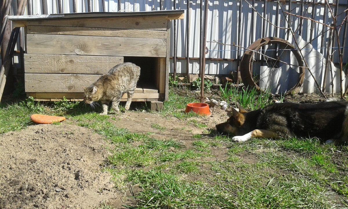 Моя собака боится кошек... Скажем так, кошки для неё - звери уважаемые, и гоняться за ними и тем более облаивать нашей 30-килограммовой Найде даже в голову не приходит. И такой кошачий "пиитет" у неё не врождённый, просто так получилось. Расскажу по-порядку. Во-первых, в доме живёт (а правильней было бы сказать "царит") кот Кокс, который с самого начала дал щенку понять, кто тут царь зверей. Пару раз чрезмерно любопытному носу попало карающей лапой, и теперь нос кошачьи границы уважает. Кот может по своему почину заглянуть в собачью будку - проверить, всё ли там по фен-шую. Найда в это время скромно лежит в сторонке, дожидаясь окончания высочайшего визита. Когда наши хвостатые приглашаются на посиделки с шашлыками, и кусок ароматного мяса направляется хозяйской рукой в сторону кота, Найда даже не смеет претендовать на чужой куш. Найда любит этого усатого засранца тирана нежной любовью. Его кошачье величество собаку милостиво терпит. Вы скажете - ну и что с того? Свой кот - он всё рав
