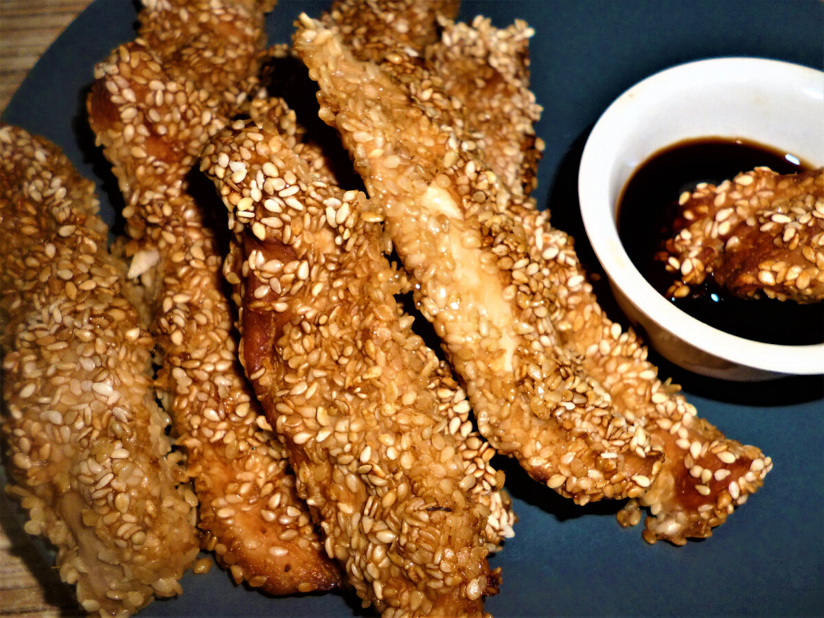 Такие куриные палочки получаются хрустящими снаружи и сочными внутри. При этом - совершенно не жирными! Ведь они не жарятся в масле, а запекаются в духовке. В результате - очень вкусная и полезная закуска. Сочность же куриному филе обеспечивает легкий маринад, о котором я сейчас расскажу. Для маринада нам потребуется соевый соус хорошего качества и сухой молотый имбирь (продается в отделах со специями). Именно этот порошок имбиря отлично размягчает мясо курочки, делает его нежным и сочным, даже лишенную жира грудку. Скажу сразу, что в готовом блюде имбирь совсем не чувствуется, его роль именно в "размягчении". А вот соевый соус придает мясу и вкус, и соленость. Кунжут, в котором запекаются палочки, пропитывает их своим ароматом. Этакий "ореховый" запах. В процессе приготовления кунжут подрумянивается и аппетитно хрустит. Вкус его отлично сочетается с куриным мясом. Приготовление: Филе куриной грудки нарезаем на продольные кусочки - палочки. Складываем филе в чашку, поливаем соевым соу