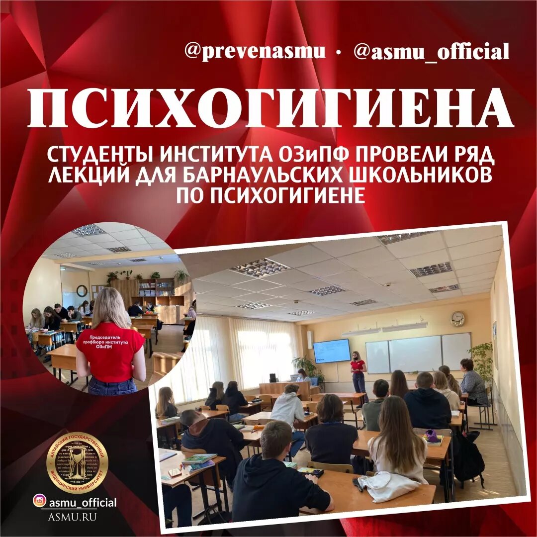 Студенты Института ОЗиПФ провели ряд лекций для барнаульских школьников по психогигиене . Профбюро Института общественного здоровья и профилактической медицины АГМУ провели ряд лекций по психогигиене для школьников МБОУ "Лицей №112". . В подготовке к мероприятию приняли участие: . председатель профбюро института общественного здоровья и профилактической медицины, Герман Анастасия; . профорги групп института общественного здоровья и профилактической медицины: Рыбин Кирилл и Зеленина Анастасия. . "Ребятам очень понравился формат "Диалог на равных", когда мы не просто показывали презентацию, но и отвечали на все интересующие вопросы, также использовали интерактивные технологии, – говорит Анастасия Герман. – Мы и в дальнейшем планируем развивать данное направление, выходить и в другие учебные заведения". . #asmu #агму #лекции_по_психогигиене_