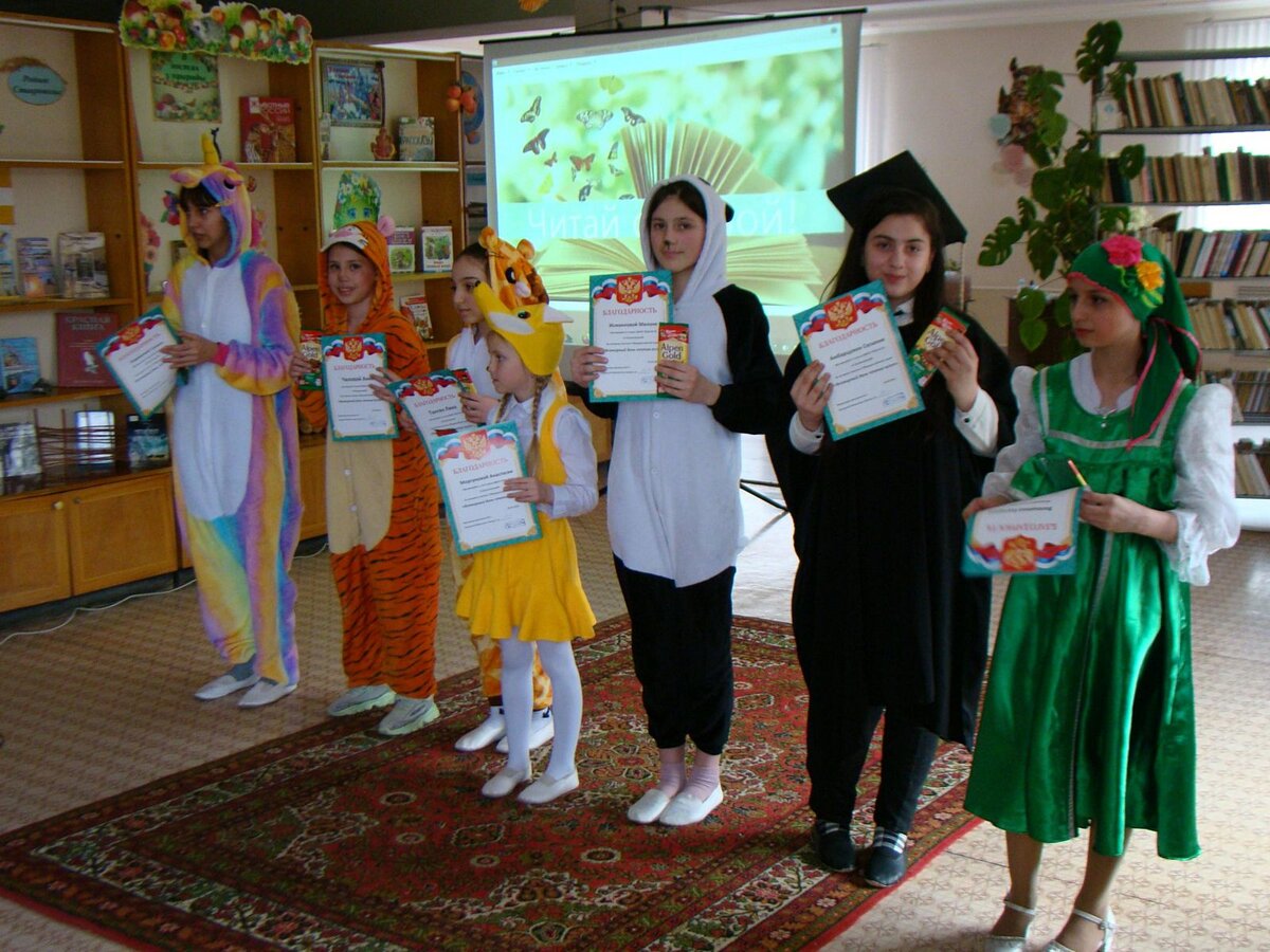 В рамках Общероссийской акции «Всемирный день чтения вслух» любители чтения – учащиеся МБОУ СОШ № 5 совершили путешествие по книголэнду «Жила-была книга», где их ждали сказочные, юмористические истории и приключения. Открылось мероприятие танцем «Есть по соседству библиотека» учащихся МБОУ ООШ № 65 ст. Ессентукской. Юные читатели совершили литературный экспресс на «Ковере-самолете», где называли произведения и автора, героя, которому принадлежат потерянные вещи, а также читали вслух строчки из книг, где говорится об этих сказочных предметах. Ребята участвовали в веселой викторине «Добро и зло», отвечали на вопросы викторины «Что любит книжка?». В читательском конкурсе «Живи, книга!» дети украшали волшебную книгу разноцветными сердечками с названиями книг, которые посоветовали бы прочитать всем книголюбам. Выполняя литературное задание «Время читать», разыгрывали лотерею на книги и зачитывали вслух отрывки из известных сказок, повестей, рассказов С. Прокофьевой, Н. Носова, М. Самарского