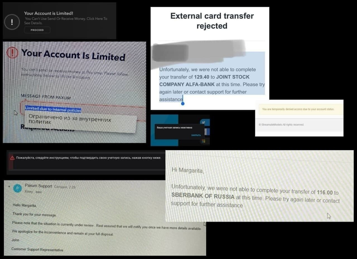 Во времена тяжёлых ситуаций, последовали новые санкции в сторону России, на этот раз пользователи начали жаловаться, что не имеют возможности вывести свои средства с не малоизвестных сайтах, как: Twitch и OnlyFans. Аккаунты OnlyFans просто исчезали из системы, без предупреждения на вывод средств. После обращений в службу поддержки - во всех случаях, приходил следующий ответ - "Здравствуйте, к сожалению, на данный момент - монетизация для граждан Российской Федерации не возможна" Многие отметили, что это максимально не справедливо, женщины подметили, что имеют стабильный доход с данной платформы, теперь временно жизнь будет иначе. Twitch - В свою очередь, поступил иначе. Вывести средства можно только через электронный кошелёк - PayPal, а аккаунты пользователей на данный момент остались на "месте". Но, многие утверждают, что это лишь временный вопрос, т.к платформа любит подстраиваться под аудиторию запада, заявляют стримеры. Никто из вышеперечисленных на данный момент никак не прокомме