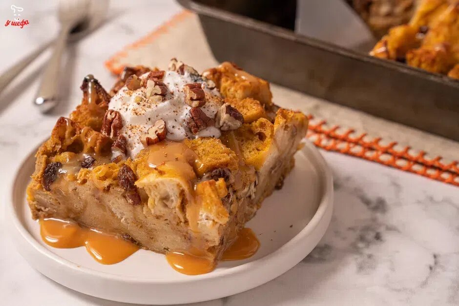 Когда-то приготовленный менее удачливыми в Англии в начале девятнадцатого века как способ перепрофилировать черствый хлеб, сегодня хлебный пудинг считается декадентским десертом. Использование тыквенного пюре в хлебном пудинге — отличный способ добавить влаги и вкуса вчерашним хлебным кусочкам. Наряду с коричневым сахаром, экстрактом ванили, корицей и мускатным орехом эти ароматы сочетаются в праздничном угощении, которое понравится всей семье. Для еще большей текстуры добавьте в смесь по горсти сухофруктов и измельченных орехов. Хлебный пудинг можно есть теплым, комнатной температуры или охлажденным из холодильника. Многие любят украшать свою порцию разнообразными начинками. Вкус тыквы и теплые специи хорошо сочетаются с острым карамельным соусом непосредственно перед подачей на стол. Завершите каждую порцию ложкой свежих взбитых сливок , нарезанных орехов пекан и посыпьте мускатным орехом. Вот вам и десерт ресторанного качества. Ингредиенты Дополнительные начинки Шаг 1 Соберите ингре