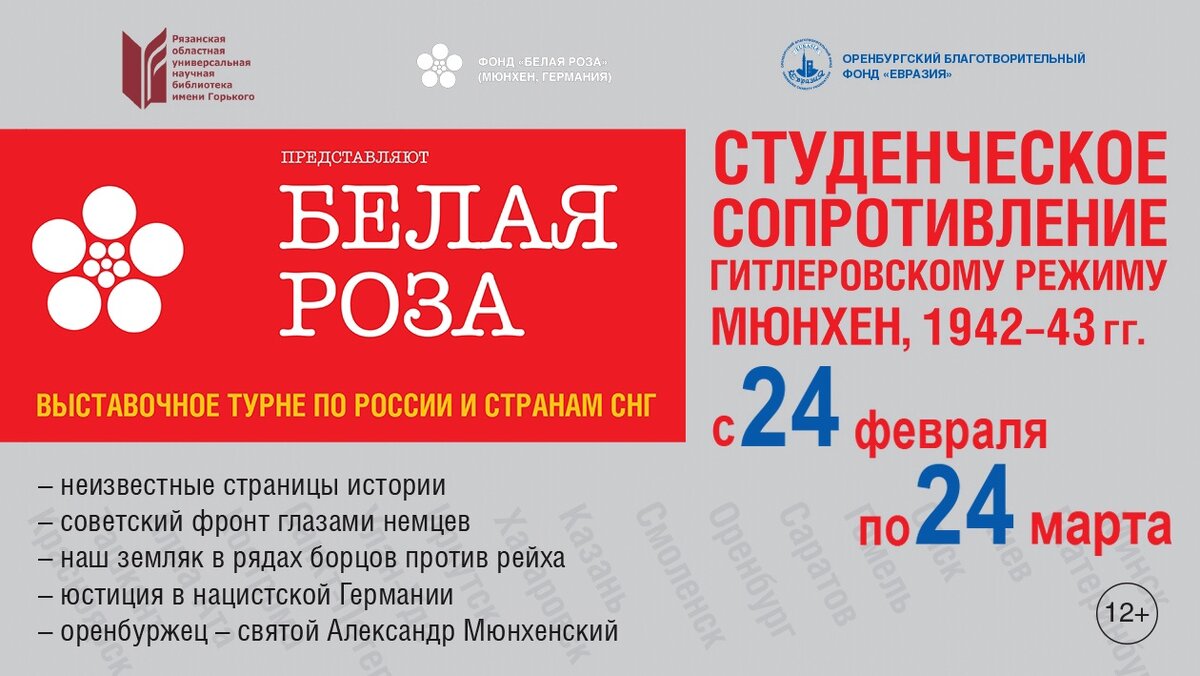 Выставка рассказывает о деятельности группы немецких студентов, распространявших в 1942-43 гг. на территории третьего рейха листовки антигитлеровского содержания под именем «Белая роза». Ее участники были казнены в 1943 году по приговору нацистского суда в Мюнхене. Являясь одной из наиболее значимых в Европе групп Сопротивления, «Белая роза» была до 1999 г. практически неизвестна в России, хотя ее деятельность во многом связана с нашей страной. Один из двух организаторов группы Александр Шморель – родом из Оренбурга и до последнего дня считал Россию своей Родиной. В феврале 2012 года прославлен Русской православной церковью за рубежом и Московским Патриархатом как святой Александр Мюнхенский. Выставка содержит информацию о молодежных движениях Германии в годы становления Третьего рейха, о судьбе основных участников группы, о российских корнях лидера группы Сопротивления, о пребывании трех студентов-антифашистов на Восточном фронте, о немецкой юстиции того времени и процессах по делу «Б