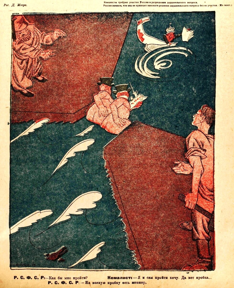 Карикатура Д. Моора сопровождается традиционной цитатой из СМИ: «Кемалисты требуют участия России в разрешении дарданельского вопроса. Россия заявила, что она не признает никакого решения дарданельского вопроса без ее участия. (Из газет.)» и подписью: