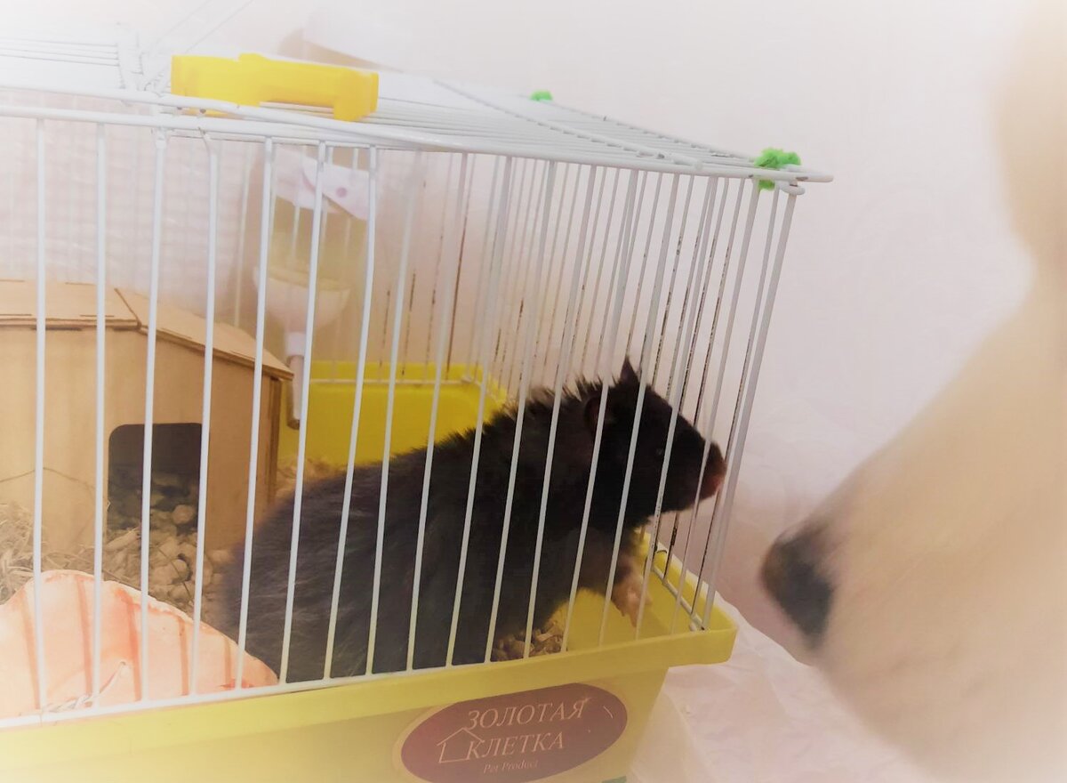 Представляете, одно существо не больше 10 см в длину (про высоту в холке даже говорить не буду, одно слово - "малявка"), другое - 58 см в холке... Сирийский хомяк Дементий и самоед Ямал. Дементий вырос и стал совершенно самостоятельным хомяком. Его появление на "публике" никак не связано с нашими нежными: "Дементий, привет, маленький, выходи из домика". Он выйдет или не выйдет. И это он решит сам. Несмотря на то, что он выкормлен Сашей, он не стал ручным. Он абсолютно независим и живет своей жизнью. Другими словами, как сейчас говорят психологи, Дементий абсолютно сепарирован. Ямал живет жизнью семьи. И хомяк его волнует. Ямала волнует все, что происходит - от шуршания упаковки с печеньем до нашего общения с Дементием. Но с некоторых пор я начала замечать появление особых отношений между ними. Ямал забегает домой после прогулки и тычется носом в дверь Сашкиной комнаты (раньше, в жизни-до-Дементия, он спокойно шел на кухню, ел и пил). Если дверь не открывается, он стучит л