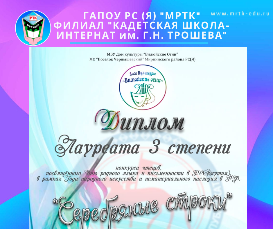 Кадет КШИ им. Г.Н. Трошева в числе победителей поселкового конкурса «Серебряные строки». С 1 по 28 февраля 2022 года обучающиеся ГАПОУ РС(Я) «МРТК» филиала «Кадетская школа-интернат им. Г.Н. Трошева» приняли участие в дистанционном поселковом конкурсе «Серебряные строки», посвященному Дню родного языка и письменности в РС(Я), в рамках празднования Года народного искусства и нематериального культурного наследия народов в РФ. По итогам конкурса кадет 7 класса Илья З. стал лауреатом третьей степени под руководством Инны Васильченко. Мы желаем дальнейших побед и высоких достижений! Лариса Батлаева, педагог-организатор. Пресс-служба ГАПОУ РС (Я) «МРТК» филиал «Кадетская школа-интернат им. Г.Н. Трошева». #КШИ_Трошева #кадеты #кадетскаяшкола #Чернышевский #КШИ #МРТК #Якутия #Мирнинскийрайон #конкурс #Серебряныестроки Ссылки по теме:
