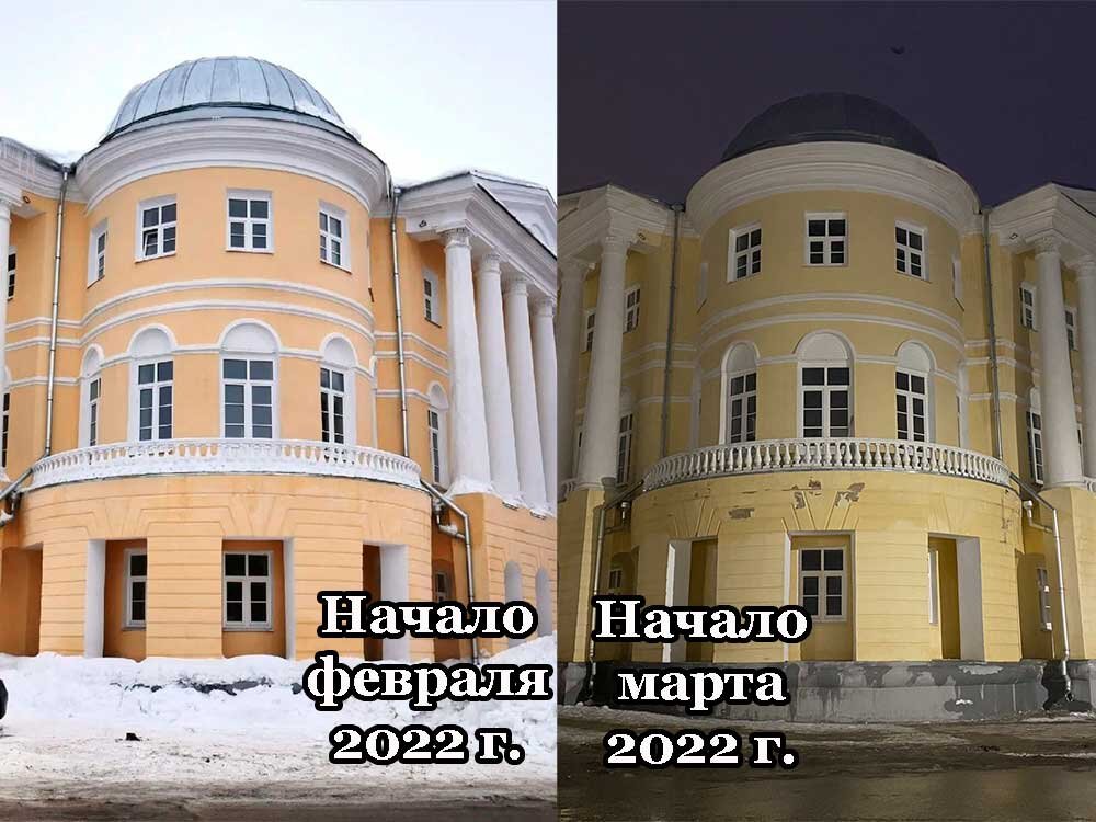 Этой зимой в Вольске закончена реставрация исторического отдела краеведческого музея. Строители сорвали сроки, потому что изначально по контракту должны были сдать объект к 1 октября 2021 года. Здание более 10 лет стояло в законсервированном виде в связи с облупившейся краской. Изначально заявлялось, что чиновники освоят 47 млн. рублей, но в процессе работ сумма могла увеличиться – информации в открытых источниках на эту тему мы не нашли. Исполнителем выступило ООО «Проектсройрестраврация», а проектной организацией – «Атриум А». Считается, будто подрядчик завершил весь комплекс работ – реконструкция кровли, замена инженерных сетей, отделка. Сейчас граждане могут любоваться, как недавно отремонтированное здание возвращается к первозданному аварийному виду. На фасаде уже облупилась краска, и можно представить, что при таком «качестве» работ происходит внутри. Для сравнения мы приводим фото двухнедельной давности из Instagram главы Андрея Татаринова, где видно, что стены выглядят идеально