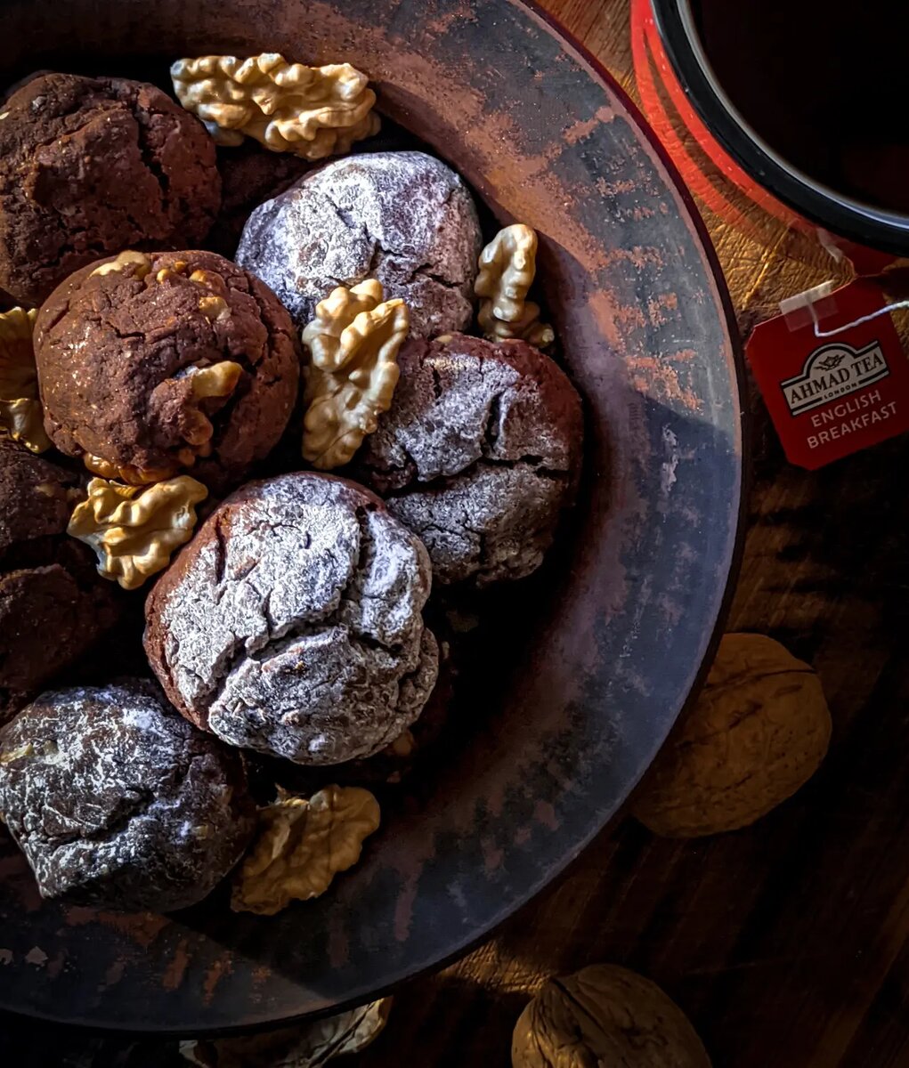 Дружочки привет! 😉✌ Знаете за что я люблю кулинарию? Кулинария для меня – это бесконечный творческий процесс. Когда-то я любил рисовать, лепить. Даже пошёл в художественную школу. Но ходил туда без особого рвения. Хотелось драйва и динамики! Было ОЧЕНЬ скучно! Ну представьте – захожу в класс рисования, а там сидит бородатый дед–препод и смотрит в окно. Непрерывно весь урок. В кабинете пахнет краской. Очень тихо и прохладно. И так насколько лет. В кабинете пахнет краской. Очень тихо и прохладно. И так насколько лет. Как–то раз, я сидел на уроке и вместо того, чтобы рисовать, я стал смотреть на "старца". И знаете что? Не отрываясь от просмотра, он прошептал мне – " Если хочешь идти, иди... "🧙♂️ Естественно я воспользовался шансом и ушел! 😄 Ушёл на кухню! Как нибудь я расскажу почему меня привлекла именно кухня, а пока я хочу поделиться с вами, своим рецептом классного шоколадного печенья! 🔻Нам потребуется: Мука 180г. Сливочное масло 120г. Грецкий орех 30-40г. Яйца 2шт. Какао 50