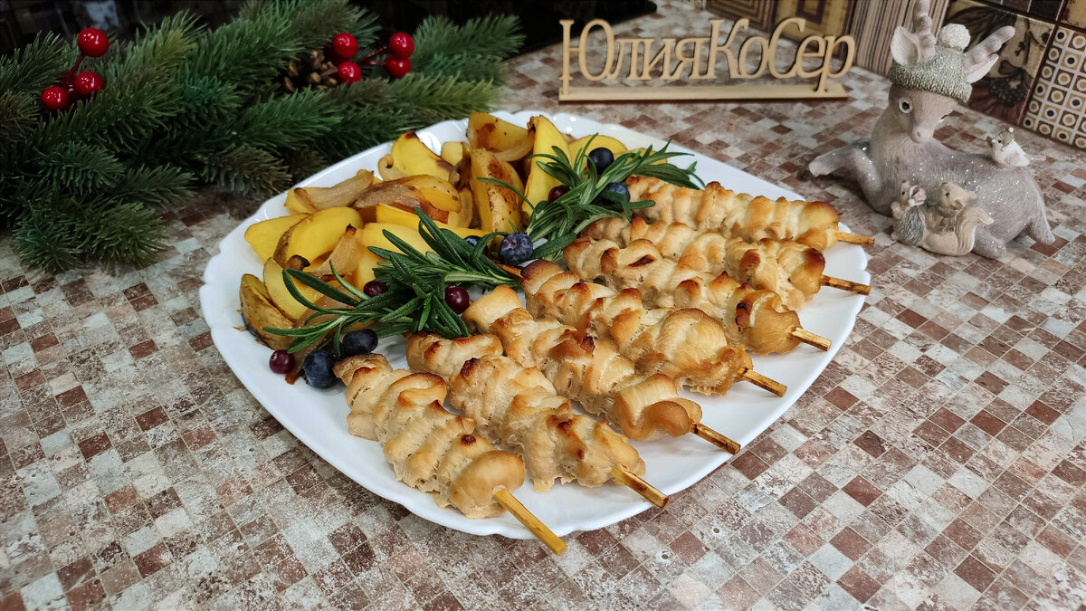 В этом видео, я с Вами поделюсь рецептом вкусной курицы на шпажках с картофелем, она готовится просто, а получается вкусной, красивой и прекрасно подойдёт для новогоднего стола.