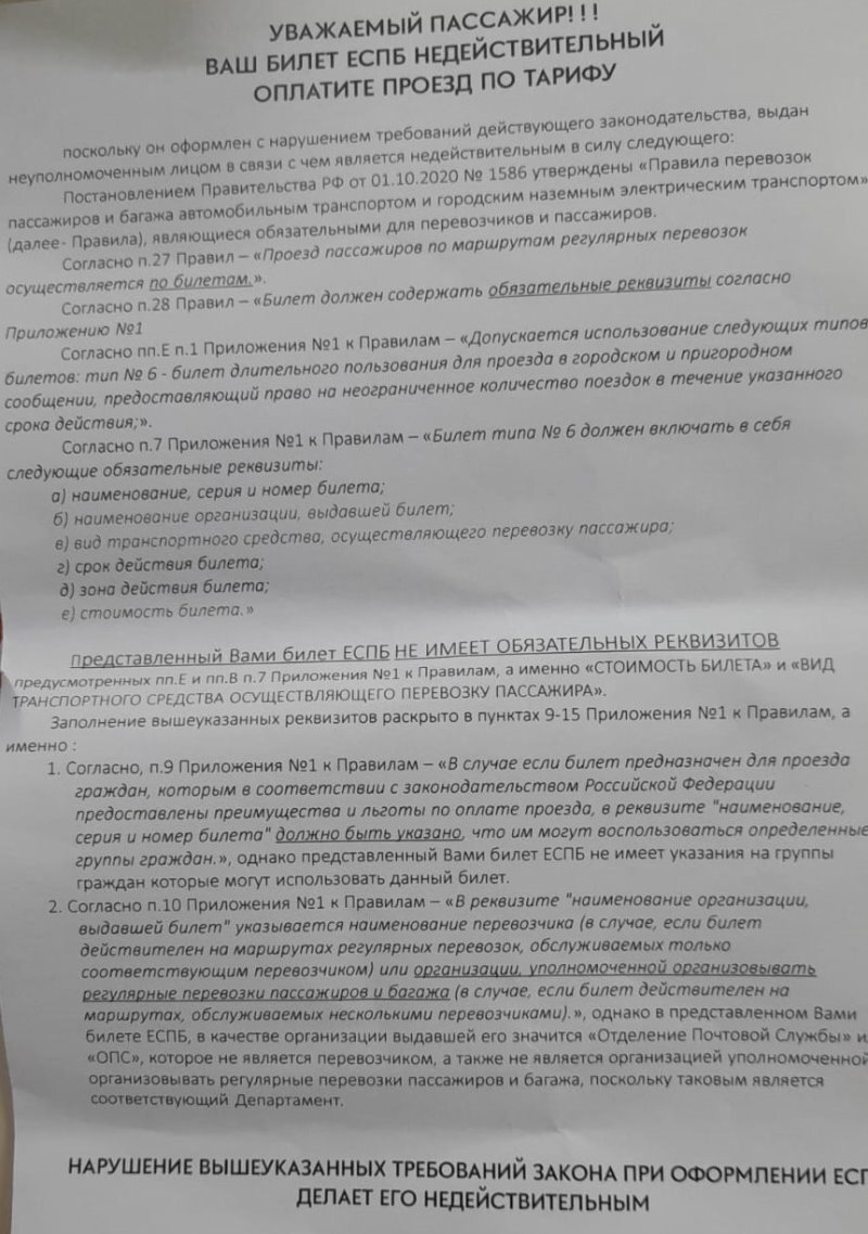 Тем временем маршрут № 401 стал распространять среди пассажиров некую листовку, в которой заявлял о недействительности ЕСПБ, как якобы несоответствующего действующему законодательству, с требованием оплатить проезд по тарифу. Чья бы корова мычала!