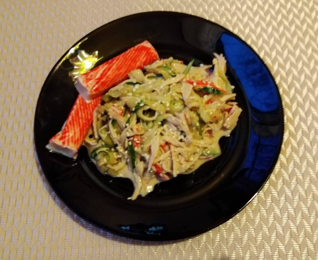 Салат из двух ингредиентов, не считая заправки. Для заправки салата можно использовать соевый соус, майонез или можно смешать соевый соус и сметану. Я делала по рецепту, где был соевый соус и майонез и эта заправка получилась очень соленой, так как и майонез, и соевый соус имеют в составе соль. Правда, салат при своей кажущейся простоте делается достаточно долго или нудно! 🙄 #салаты #закуски #перекус #огурцы #крабовыепалочки Ингредиенты: Свежий огурец, Крабовые палочки, Кунжут, Заправка, Соевый соус, Сметана, Или только майонез Способ приготовления: Огурец вымыть. Овощечисткой нарезать тоненькие полосочки. Далее их ножом разрезать на тоненькие длинные полосочки, их разрезать на длину около пяти см. Далее крабовые палочки вилкой разбираем на волокна. Заправляем салат соевым соусом со сметаной. Можно использовать один майонез, но его не нужно мешать с соевым соусом, так как будет слишком соленый салат. Добавляем кунжут. Салат готов. Приятного аппетита! 👍🌹🌺