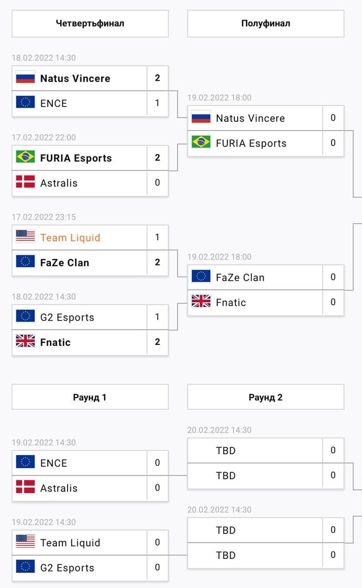 IEM Katowice 2022 по CS:GO: Natus Vincere победили ENCE в матче группы B. В следующей игре команда поборется с FURIA Esports, начало запланировано на 19 февраля 18:00 по московскому времени. В группе А Virtus.pro обыграла Ninjas in Pyjamas и прошла в плей-офф. Завтра VP сразится с Heroic в 21:00 по мск. Во втором раунде нижней сетке сегодня сразятся Gambit - Team Vitality, начало в 21:30.