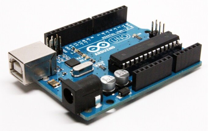 Arduino - это электронное устройство, состоящее из одной печатной платы, способное управлять разными датчиками, электродвигателями, освещением, передавать и принимать данные... Arduino - семейство устройств разных размеров и возможностей. "Мозг" Arduino - это микроконтроллер семейства Atmega. Микроконтроллер представляет из себя микропроцессор с памятью и различными периферийными устройствами, реализованный на одной микросхеме. Фактически это микрокомпьютер, способный выполнять относительно простые задачи. На фото микроконтроллер Atmega328. Такие микроконтроллеры стоят на Arduino UNO. Но какой толк от мозга, если он не имеет рук? Руками в данном случае служат электрические выводы, размещённые по периметру платы Arduino. Есть платы с большим количеством выводов, есть с меньшим. Например, самая большая плата в семействе Ардуино - Arduino Mega - имеет более 70 независимых выводов, а самая маленькая - Arduino Pro Mini - всего 22 вывода. На фотографии показаны в сравнении Arduino