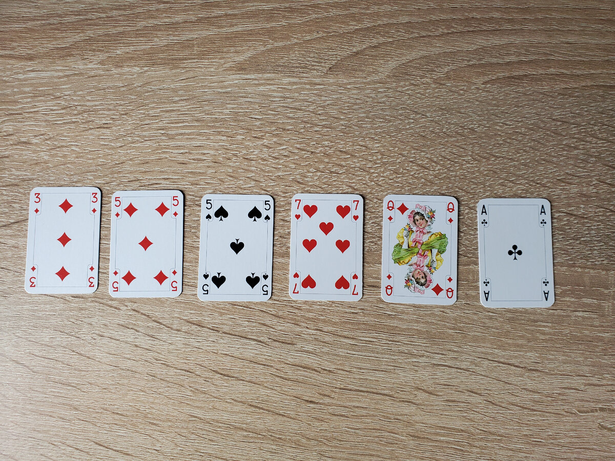 Простой арифметический пасьянс на 52 карты. Цель пасьянса - удалить карты в отбой. Каждая карта имеет свою стоимость: от туза до семерки в соответствии с номиналом. Остальные карты очков не имеют. Выкладываем 6 карт в ряд. Пары карт, которые в сумме дают 7 очков и семерки удаляют в отбой, а карты от восьмерки до короля выкладывают над рядом в 6 карт. В нашем примере мы можем удалить только 7, а Д перемещаем в верхний ряд. Как только в этом ряду собраны карты от 8 до К, их также удаляют в отбой. В этом ряду карты могут находится только по одной одного достоинства. Ни две восьмерки, ни три девятки там находится не могут. Пустые места в раскладке замещаем из колоды следующими картами. Теперь можно удалить тройку и туза. Продолжаем, пока не остановится пасьянс.
