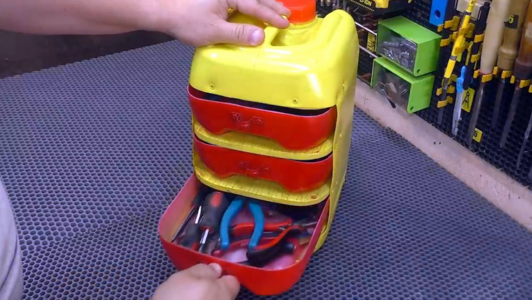 Добрый день, дорогие читатели моего канала! Почти у каждого простого работяги в гараже валяется не нужная канистра, вот и я один из таких. Но недавно решил я сделать из неё хороший органайзер для предметов, а то что она валяется без дела! Для начала нам нужно вырезать самую большую сторону у канистры, по вертикали режем ровно по краю, а по горизонтали отступаем по 5-7 см от краев. Далее берем точно такую же канистру и отрезаем ей верх и дно (по высоте не больше 10 см, но должны они быть одинаковыми). После этого берем лист фанеры, с помощью обрезанного верха рисуем размер полочек полочек и вырезаем их. Полочек в канистре должно быть от 2 до 4, не больше, иначе она не выдержит. Далее закрепляем вырезанную фанеру в канистру с помощью шуруповерта на расстояние 10 см друг от друга. Если вам нужна простая тумбочка, то все готово, но нам же нужен хороший органайзер, поэтому мы берем обрезанный верх и дно и вставляем их в нашу канистру, это будет нашими ящичками. Вот такая простая самоделка