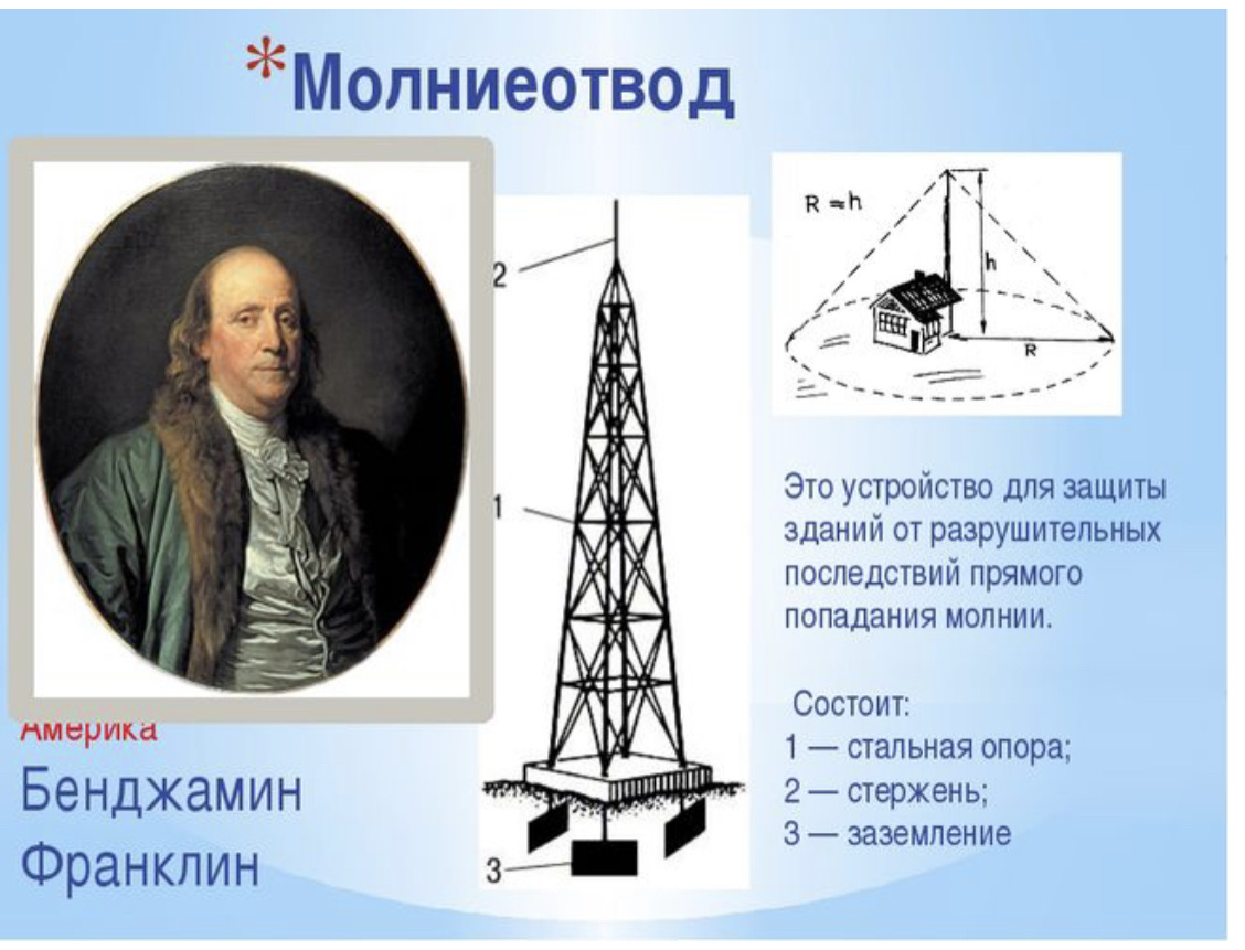 Почему вчера решила вспомнить Франклина? Да потому что он и для физики много сделал, а ведь именно эту превосходную науку я хочу продвигать в массы. Что же такого придумал Бенджамин, чтобы о нем можно было рассказать в этом контексте? В 1752 году он придумал громоотвод, что позволило здания и сооружения защищать от удара молнии, а, следовательно, от пожаров. Я понимаю, что физики и люди прекрасно знающие эту науку вряд ли будут меня читать, мой контент для тех, кто по каким- либо причинам пропустил это в детстве, отрочестве, юности, зрелости...😶 и только сейчас навёрстывает упущенное, потому что сам заинтересовался, или ребёнок задаёт вопрос, который загоняет в тупик. ХОЧУ рассказывать самое интересное, увлекательное, те вещи, которые останутся в памяти. Например, что Франклину и его изобретению не все поверили, Европа не оценила его творения и, по иронии судьбы, получили «ответочку» от Вселенной. В городе Филадельфия на все дома установили громоотводы, кроме гостиниц и французск