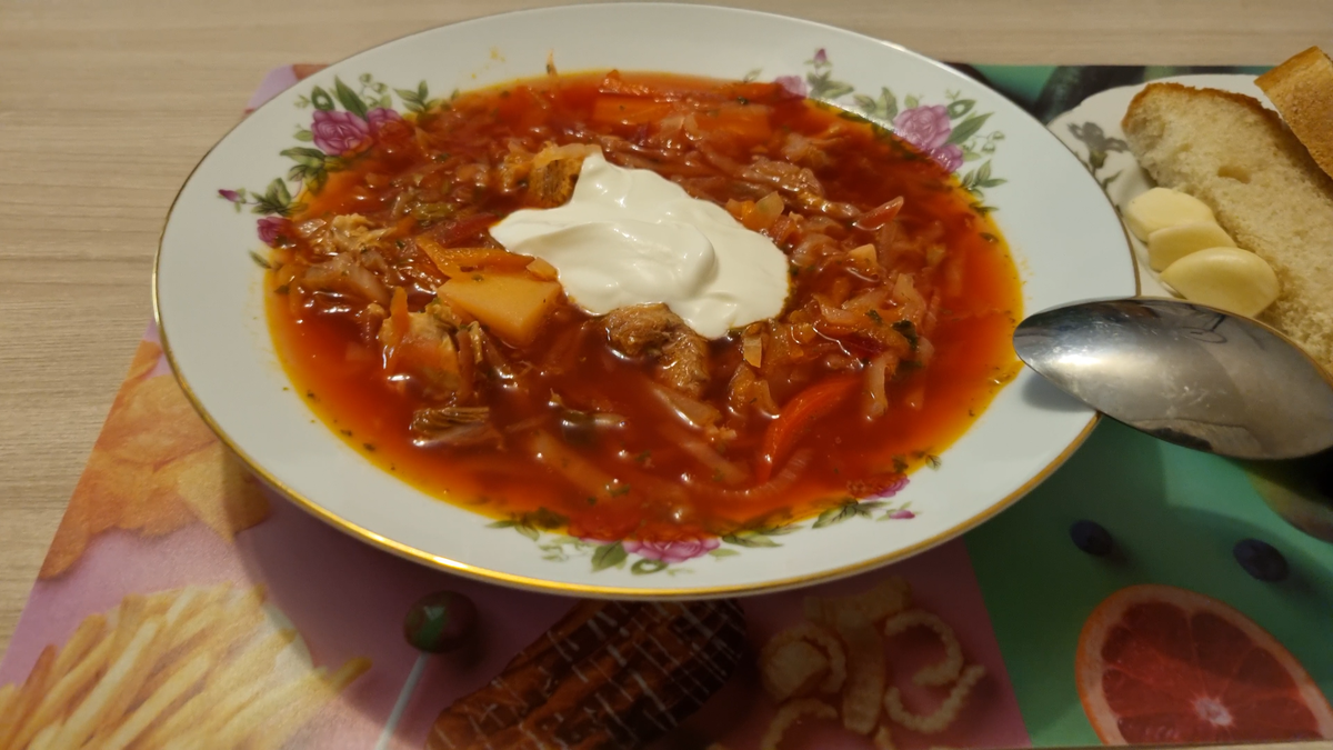 Вся моя семья, а в особенности муж, очень любит борщ! Красный, насыщенный, со сметаной и чесноком! Самое-то в холодные зимние деньки! Малыши не очень жалуют капусту, поэтому стараюсь им её не накладывать.