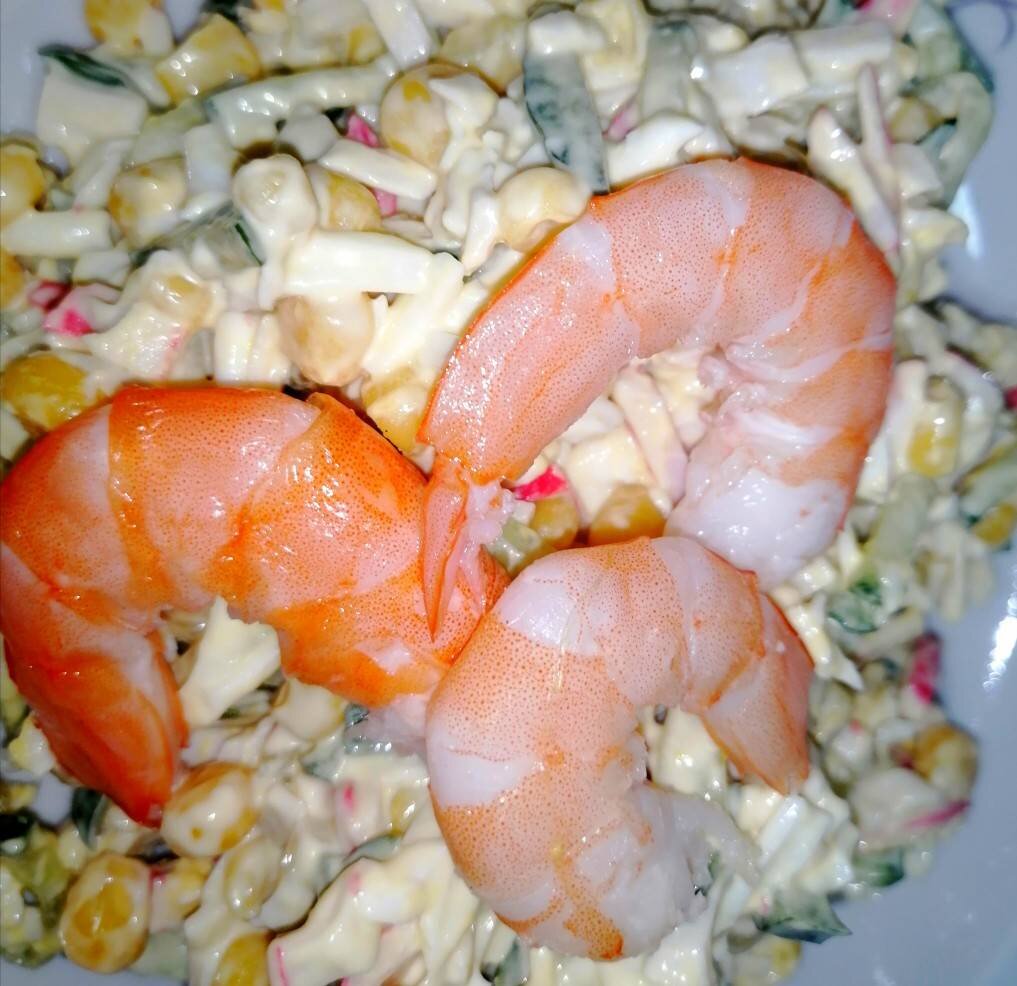 Проще простого и очень вкусно. Ингредиенты: Кукуруза консервированная, Крабовое мясо, Огурец свежий, Креветки для украшения, Майонез, Яйца Способ приготовления: Крабовое мясо нарезать тонкими полосками, яйца отварить и натереть на крупной тёрке, огурец нарезать также, полосками. Слить жидкость из кукурузы и добавить к салату. Салат хорошо перемешать, заправить майонезом и украсить креветками порционно. Готово. Приятного аппетита. ❤️