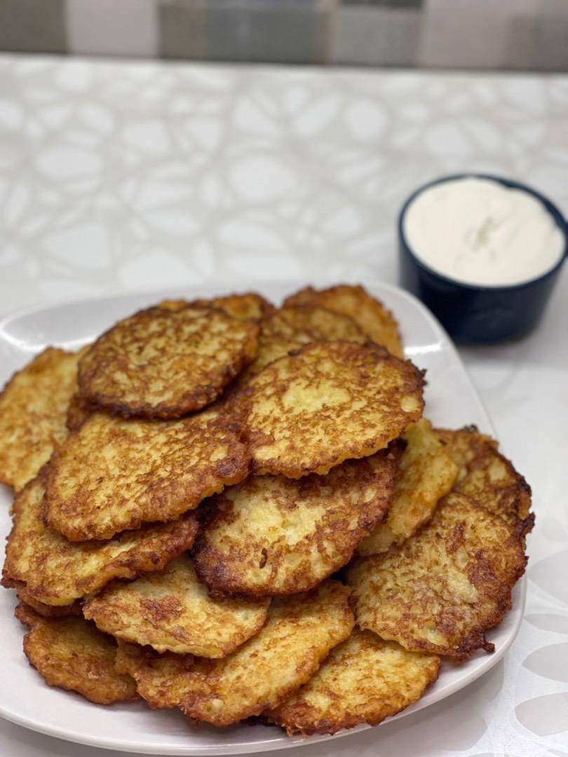Ингредиенты: очищенного картофеля, очищенного репчатого лука, крупных яйца, сметаны, муки, твёрдого сыра, соль, перец , растительное масло для жарки Способ приготовления: Очистить картофель и лук. Измельчить с помощью мясорубки или натереть на мелкой тёрке. Посолить, поперчить. Тщательно перемешать. Слить лишнюю жидкость. Добавить яйца, муку, сметану, сыр. Снова перемешать. Разогреть сковороду с растительным маслом. Выкладывать столовой ложкой драники. Обжаривать на среднем огне до золотистой корочки с обеих сторон. Подавать со сметаной. Приятного аппетита!