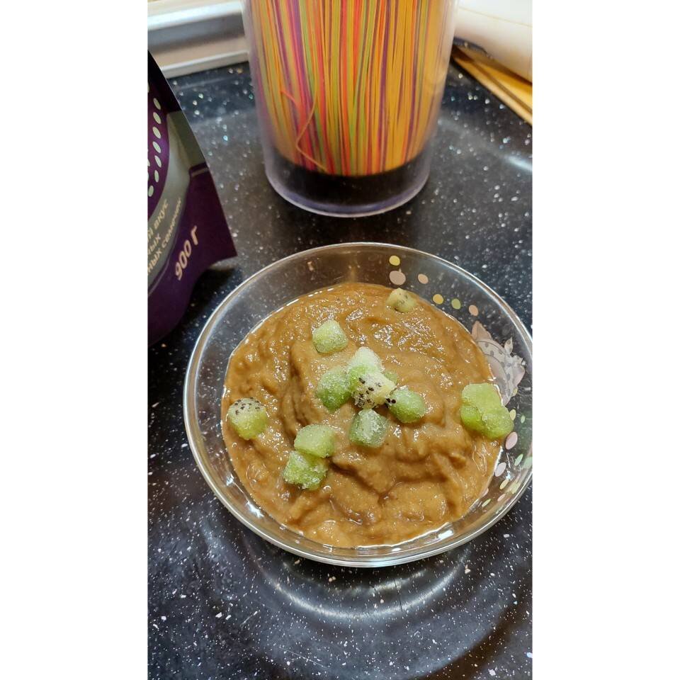 Ингредиенты: банан, яблоко, сельдерея, подсолнечного протеина, воды, киви Способ приготовления: Яблоко очистить, нарезать. Банан поломать. Сельдерей нарезать кубиком. Добавить протеин и воды, взбить погружным блендером. Украсьте фруктами, у меня киви.