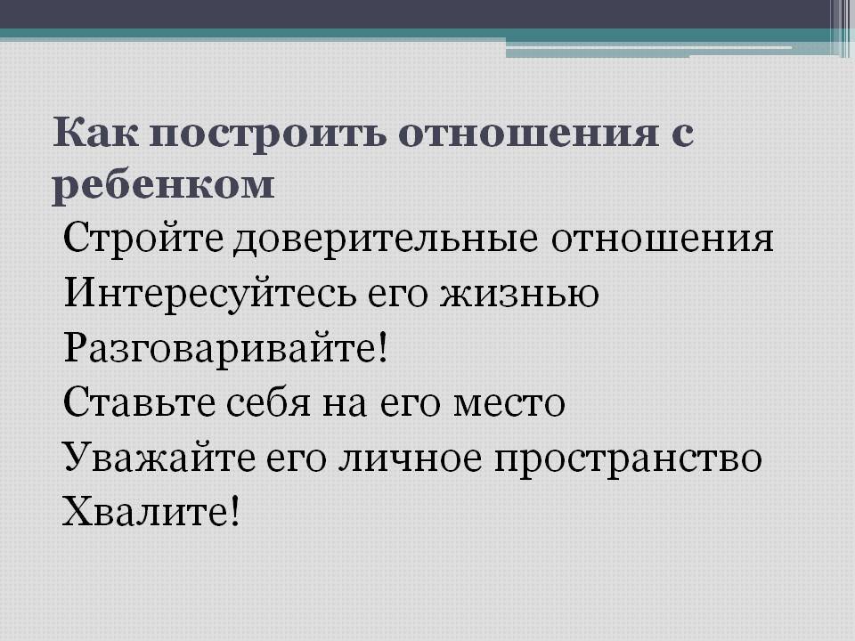 Ваш ребенок подрос и ваши отношения стали напряженными? Не переживайте! Давайте попробуем справиться с этой проблемой! Правило №1. Доверие Стройте доверительные отношения. Пусть ребенок понимает, что все, что происходит в его жизни он может вам рассказать. Все! Правило№2. Интерес Искренние отношения с ребенком – вот что вам нужно! Демонстрируйте свою открытость. Даже если нет моральных и физических сил – 5 минут на вопрос «Как прошел твой день?» нужно найти. Правило№3. Ставьте себя на его место Иногда слушая ребенка, мы думаем о том, что его проблема – это не проблема. Мы, конечно, судим с уровня взрослого человека. Но, нужно понять, что он еще не находиться в вашем возрасте и у него все впереди. А то, что он переживает – это заслуживает внимания и поддержки! Правило №4. Уважайте его личное пространство Уважайте его личные границы! Не входите без стука в его комнату, не читайте его дневник, записи в блокноте, сообщения. Правило №5. Хвалите! Критика, конечно, бывает конструктивна… Но…По
