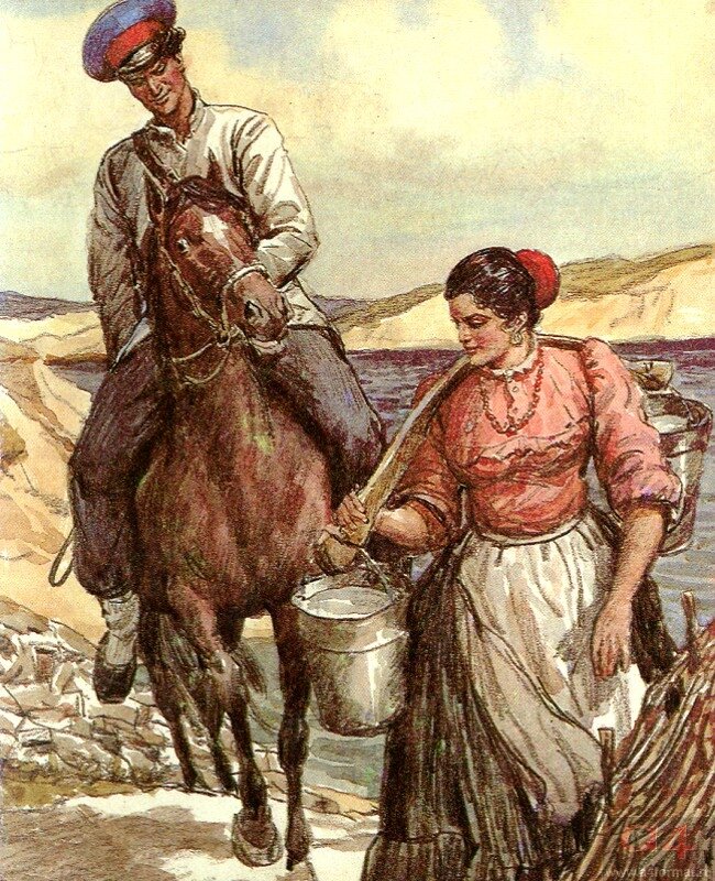 Не так давно начала читать роман-эпопею Михаила Шолохова "Тихий Дон" в школе. Нам задали выписать из первой части цитаты, которые больше всего понравились, а после объяснить, почему именно эти цитаты. До старости не слиняли на нем вороной масти борода и волосы... Горбатый нос его блистал, как свежелакированный, во впадинах черных щек томилась испарина. Он улыбнулся, разом обнажив в вороной бороде несчетное число белых, частых зубов, и занес косу, поворачивая морщинистую шею вправо. Мне очень понравилось, как описывают род Мелеховых в этом романе. Сразу представляешь, какие они были красивые, диковато-красивые, мужественные. Красота у них была какая-то необузданная, вольная, восточная. Это очень красиво, я бы хотела увидеть человека с жгучей казачьей и турецкой кровью! Затравевший двор выложен росным серебром. Выпустил на проулок скотину. Дарья в исподнице пробежала доить коров. На икры белых босых ее ног молозивом брызгала роса, по траве через баз лег дымчатый примятый след. Пантеле