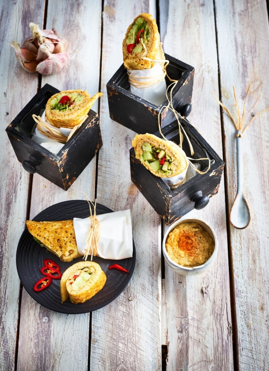 Вы хотите чего-то особенного на закуску и являетесь сторонником вегетарианской диеты? Тогда рецепт рулетов с нутовым кремом - правильный выбор. Эта закуска помещается в вашей руке, кроме того, у нее отличный вкус и уровень подачи! Ее можно есть почти все время, потому что у него много вариаций и, например, для сторонников мясной диеты в нем может быть спрятано много жареного мяса и овощей. Так что давайте сделаем это 🙂 Ингредиенты (10 половинок обертки): Для теста: 250 мл сыворртки 2 средних яйца 20 г сахара 150 г обычной муки 1 чайная ложка пищевой соды 1 чайная ложка разрыхлителя 1 большая щепотка морской соли масло для жарки Для нутового крема: 100 г сушеного нута 420 мл воды 1 чайная ложка тмина щепотка порошка паприки морская соль и перец 70 г пасты тахини 1 зубчик чеснока, измельченный 30-40 мл свежевыжатого лимонного сока 40 мл оливкового масла Для начинки: 250 г огурца 1/2 острого перца 1 красный перец чили с удаленными семенами 50 г ростков фасоли или кресс-салата молот