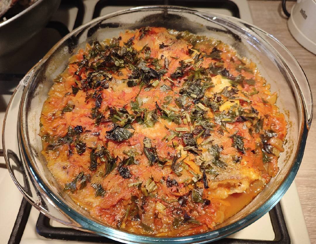 Рецепт дуже ніжної та смачної рибки з самих простих продуктів..виходить дуже диєтично, корисно та надзвичайно смачно.. #ігри Ингредиенты: хека в мене тушки, велика морквина, середні цибулини, томатного соусу (в мене свій домашній), рисового борошна, часнику, води або бульону, сіль, спеції та зелень за смаком, трохи олії для смаження Способ приготовления: Підготуємо нашу рибку. Я думала вона буде зачищена, але виявилося що вона через одну чищена..прийшлося дочищати луску, плавники і чорні плівки..потім добре миємо, ріжемо на кусочки та солимо, перчимо, додаємо улюблені спеції. Готуємо соус: підсмажуємо цибулю порізану чверть кільцями та часник, додаємо натерту моркву та готуємо до м'якості моркви. Потім додаємо томатний соус, спеції, сіль за смаком, воду та хвилин 5-7тушкуємо на невеличкому вогні. Далі беремо нашу рибку, обвалюємо в борошні і злегка обсмажуємо з двох сторін. Потім в каструлю викладаємо половину нашого соусу, обсмажену рибку та заливаємо другою частиною соусу. Додаємо зе