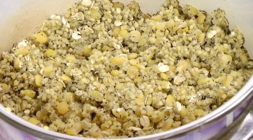 Отваренная перловка (300 гр), кукурузная крупа (300 гр) и 400 гр панировки смешиваются в кастрюльке. Туда же засыпают 100 гр кукурузы, небольшое количество меда и растительного масла.