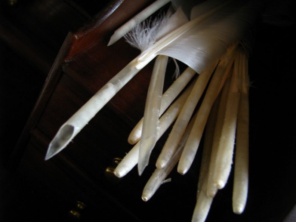 Знаток каллиграфии М. Паллафон, во французской книге 1763 года издания, поведал, как правильно изготовить перо для письма. По его сломам, перо следует брать из левого крыла гуся. При зачинке его нужно соблюдать определённую последовательность операций. Самое трудное – это правильно сделать щель для вытекания чернил. Её прорезают в самом начале и всю дальнейшую работу ведут так, чтобы она оставалась точно посередине.