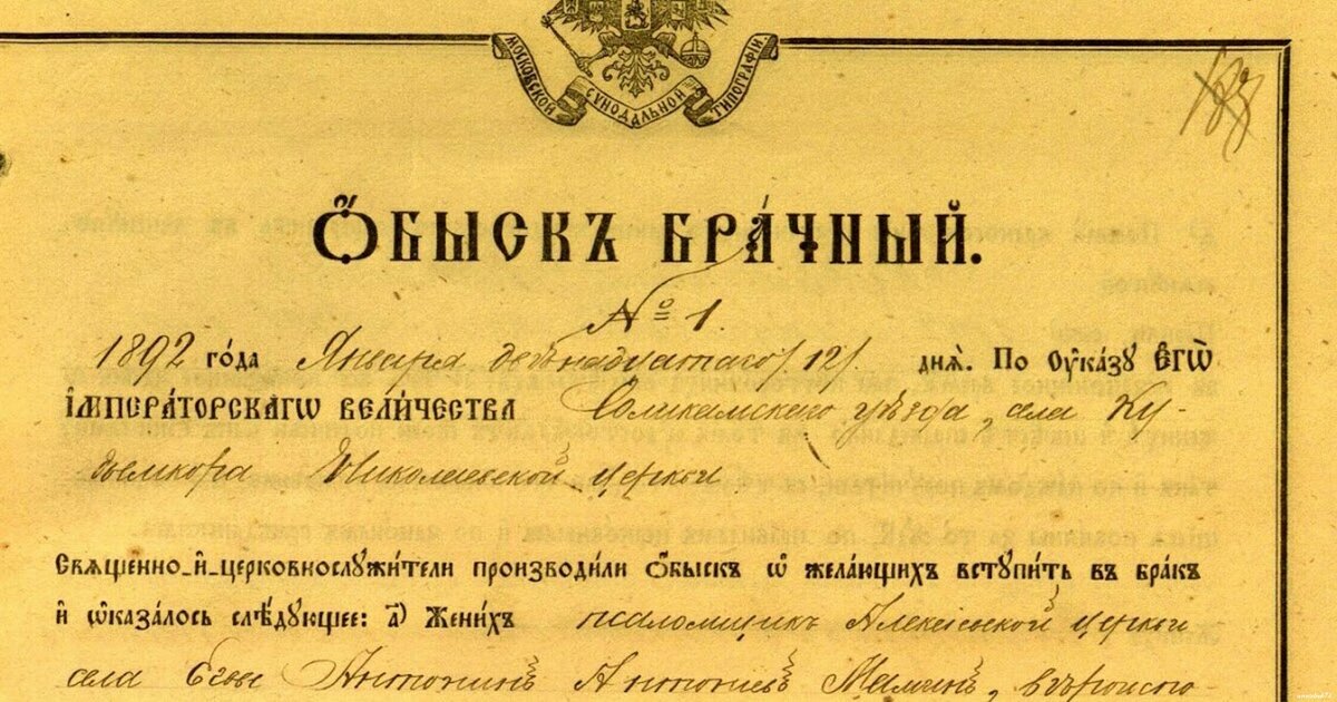 Интересный документ, сохранившийся в небольших количествах, но содержащий большое количество личной информации, называется брачный обыск. Брачные обыски вводились указом Сената в 1765 году. Велись книги с брачными обысками священниками приходов. В них фиксировались различные сведения о лицах, вступавших в брак (что делает их весьма любопытным историческим источником): • Звание и состояние; • Место жительства; • Возраст; • Отсутствие физического и духовного родства и свойства; • Семейное положение; • Взаимное согласие (факт того, что брак заключается не по принуждению родителей или одной из сторон). Правдивость указанных в обыске сведений подтверждалась документами – выписками из метрических книг, паспортами, и другими. Жених и невеста оставляли свои подписи, подтверждая верность записей. Свои подписи оставляли также духовные лица, составлявшие обыск, а также восприемники по жениху и невесте. Как видно из вышеописанного, брачные обыски в целом повторяют содержание записи о бра