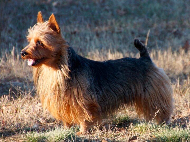 Австралийские терьеры были выведены в XIX веке. К сожалению, в настоящее время не известно, какие именно породы были использованы для скрещивания. Специалисты предполагают, что в выведении приняли участие несколько разновидностей британских терьеров, так как эти собаки имеют множество общих черт. В прежние времена небольшие австралийские терьеры помогали фермерам избавляться от крыс, змей и норных хищников. Кроме того, они оказались очень бдительными сторожами и охраняли фермы английских эмигрантов от злоумышленников. Страна происхождения: Австралия Масса: 5-6,6 кг Рост в холке: 24,5-25,5 см Окрас: Голубой, песочный, рыжий, серо-голубой с подпалом Использование: Крысолов, сторож, собака-компаньон Темперамент и характер Австралийские терьеры очень дружелюбные и жизнерадостные собаки, которые одинаково хорошо чувствуют себя на природе и в условиях города. Они любят частые прогулки и активные игры, необходимые для того, чтобы питомец ощущал себя счастливым. Австралийские терьеры хорошо