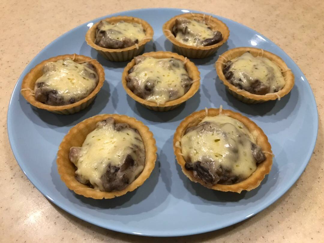 #меню Ингредиенты: Куриная грудка, Шампиньоны, Сыр, Лук, Сливки, Мука, Соль, Тарталетки Способ приготовления: Куриную грудку мелко нарежем и отдельно обжарим на сковороде, но не зажариваем, чтоб не пересушить, буквально чтоб выкипела вода. Отдельно пассеруем мелко нарезанный лук. Затем к луку добавляем мелко нарезанные грибы и жарим до готовности. Соединяем грибы с грудкой, перемешаем. Вливаем немного сливок, перемешаем и тушим минут 5. Затем вливаем ещё немного сливок, добавляем муку. Перемешаем и вливаем оставшиеся сливки. Периодически помешиваем до загустения. Солим по вкусу. Полученную массу раскатываем по тарталеткам. Сверху выкладываем натёртый сыр. И отправляем в разогретую духовку минут на 10, чтоб расплавился сыр. Приятного аппетита 👌🏻.