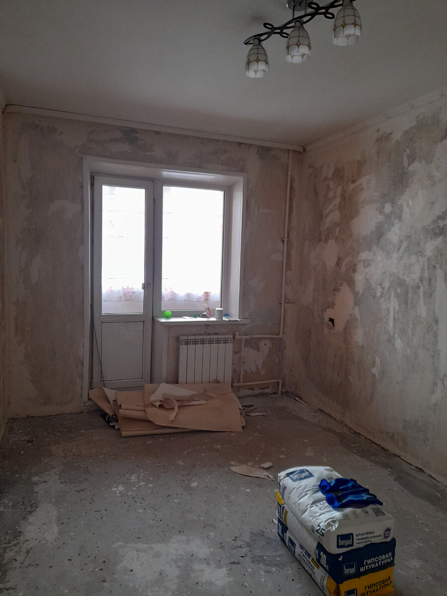Данная комната находится в 3-ком. квартире панельного девятиэтажного дома, в дальнейшем она будет обустроена под гостевую. "Трешка" была в обычном состоянии с косметическим ремонтом, примерно десятилетней давности. Поэтому после покупки, новая владелица решила сделать полный бюджетный ремонт. Перед нами была поставлена задача: визуально выровнять, зашпаклевать стены под обои, и пол под линолеум, установить натяжные потолки, наклеить обои. Начали, как обычно с демонтажа старого покрытия со стен: обоев, шпаклевки. Радиатор мы на время отделки сняли, для того чтобы за ним также зашпаклевать и наклеить обои. Как видно на фото в добавок ко всему, под подоконником все потрескалось и торчала пена. В процессе отделочных работ: мы убрали лишнее, обрезали ровно пену, сначала забили штукатуркой большие дыры, когда раствор высох, проклеили сеткой серпянкой и, выровняли слоем штукатурки, потом шпаклевки. Комната в процессе демонтажа. После того, как удалили со стен остатки старого покрытия, прогрун
