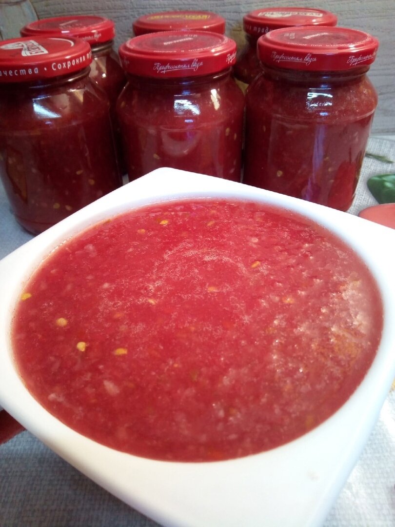 На пятом месте моих рецептов аджика из кабачка, история рецепта очень интересная. Лето, я пришла на работу без обеда(ничего с собой не взяла), коллега принесла с собой баночку аджики из кабачка, предложила мне кусочек хлеба и попробовать аджику, если честно я была очень голодна, намазала на хлеб аджику, укусила, и вот тут как в фильмах бывает, музыка играет, глаза закрыты и каеф..это было очень вкусно! Взяла рецепт, приготовила дома на зиму, все съели, готовила ее много, но недостаточно, на сегодняшний день ни одной баночки не осталось. Готовить буду и в этом году 100 %.
