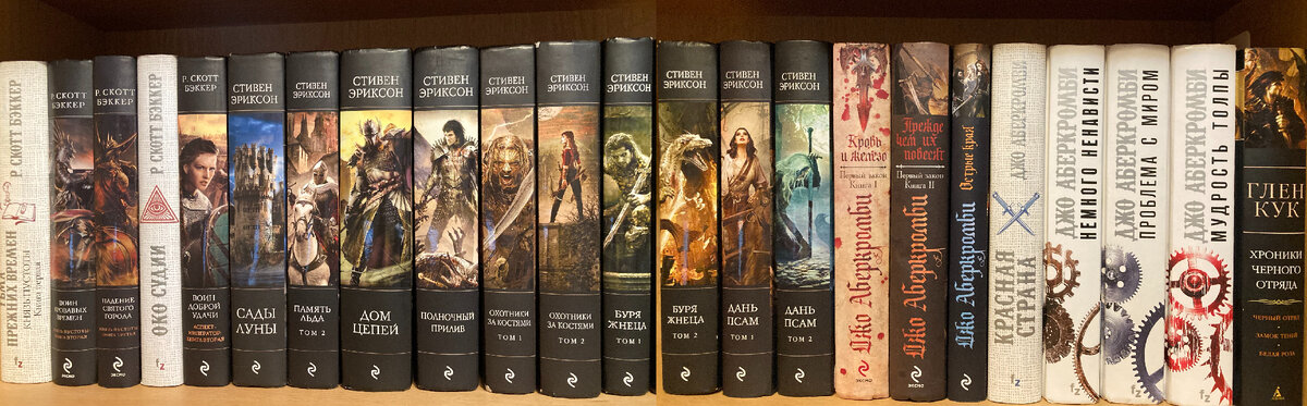 Оставил напоследок, самый сложный цикл, сложность заключается в огромном количестве действующих лиц. Стивен Эриксон написал 10 романов, 9 из них уже переведено на русский. Начиная читать первую книгу Сады Луны находишь аналогию с Чёрным отрядом Гленна Кука. Тоже отряд, тоже клички, тоже империя, но немного углубившись понимаешь, что это более сложное произведение.