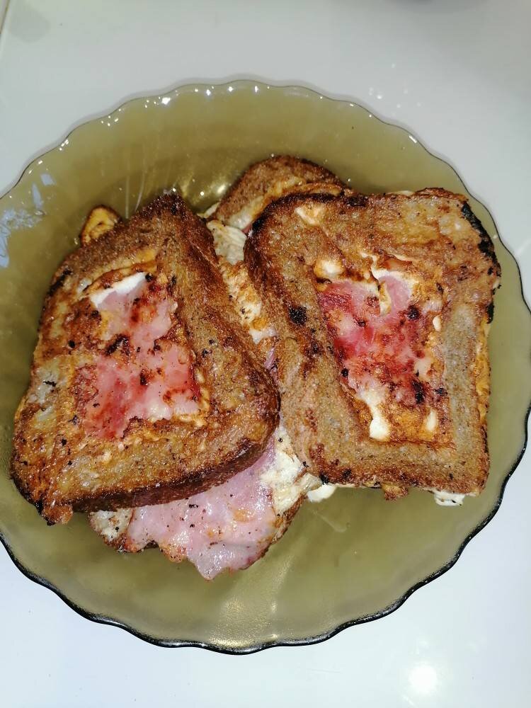 Ингредиенты: Хлеб ржаной , Бекон, Яйцо куриное, Соль и специи, Сыр, Масло подсолнечное для жарки Способ приготовления: Отрезаем хлеб, вырезаем середину (потом пойдёт на бутерброды), на сковороду наливаем масло, разогреваем и обжариваем гренки с двух сторон. Пока обжариваем гренки, разбиваем яйца и взбиваем (белок и желток), режем мелкими кубиками сыр и добавляем в взбитую массу, солим и перчим. Внутрь гренки выкладываем бекон, заливаем яично-сырную массу и обжариваем с двух сторон. Так проделываем со всеми гренками. Приятного аппетита друзья!