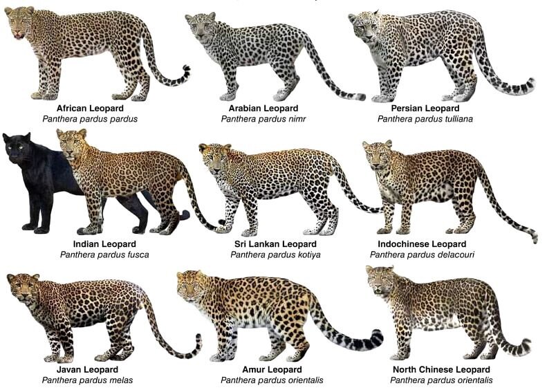 леопард образует 9 подвидов, которые различаются главным образом окраской и расположением пятен. Однако недавние работы по изучению их ДНК показали, что только восемь или девять из них можно считать достаточно обособленными. Следующий список показывает разделение первоначально описанных подвидов в пределах генетически подтвержденных подвидов.