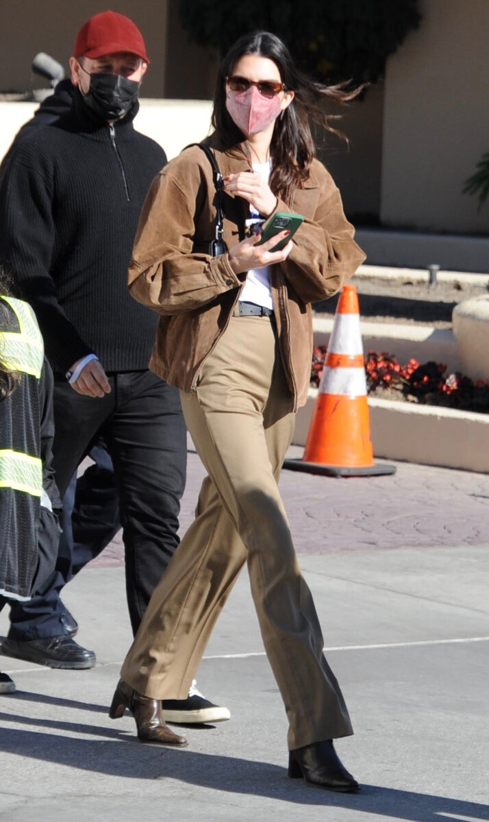 Земляные оттенки продолжают то и дело появляться в звездном стритстайле — на этот раз Кендалл Дженнер берет на себя роль адепта этой новой колор-тенденции. Коричневая палитра прекрасно вписывается в любимый ковбойский стиль супермодели, который она часто предпочитает для своих casual-выходов. Звезда подиумов выгуливает комбинацию с брюками, легкой курткой и сапогами на каблуке — все в оттенках коричневого. Лук дополняют сумка на одно плечо, солнцезащитные очки и защитная маска.