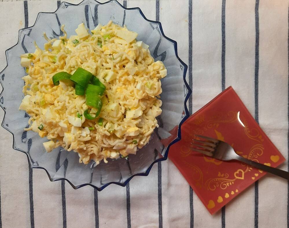 Ингредиенты: лапши быстрого приготовления, кипяток, зелёного лука, яиц, соль, перец Способ приготовления: Лапшу поломать в пачке, залить кипятком и дать постоять 7 минут. Яйца отварить и нарезать кубиками. Зелёный лук нарезать. Лапшу слить, переложить в салатник, добавить яйца и лук. Салат заправить майонезом, поперчить, посолить и перемешать. Приятного аппетита. Если Вам понравился рецепт: буду рада увидеть Ваши фотоотзывы и комментарии.