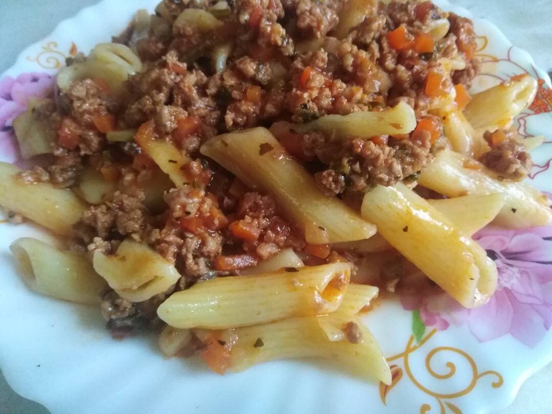 #меню Ингредиенты: фарш говяжий, репчатый лук , шампиньоны , морковь, помидоры, петрушка, томатная паста, сахар, вода, молоко, уксус бальзамический, соль, перец, базилик сушеный, сливочное масло Способ приготовления: На сливочном масле обжарить шампиньоны. Добавить лук, жарить до его прозрачности. Всыпать порезанные морковь и петрушку. Обжарить. Добавить фарш. Обжарить до испарения жидкости и зарумянивания. Посолить, добавить перец, базилик и порезанный помидор. Жарить минут 5. Томатную пасту развести с водой и сахаром. Влить в фарш, затем влить молоко и бальзамический уксус. Тушить в течение 1 часа под крышкой, на тихом огне. Приятного аппетита!!!