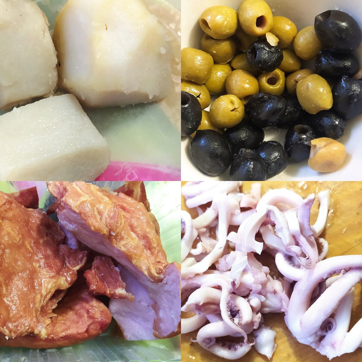 Люди, имеющие один выходной день поймут меня. После 6- дневной напряженной рабочей недели в воскресенье совсем не хочется покидать "родную берлогу". Даже для того, чтобы пополнить запасы продуктов... Будем готовить из того, что оказалось в холодильнике. Из остатков продуктов по счастливой случайности на сегодня были 3 половинки отварного картофеля, по половинке пачки оливок и масли (примерно по 50 грамм), обрезки окорока, который не подошел на бутерброды, щупальца кальмара (примерно половина баночки). Сразу оговорюсь, что продукты кладу "на глаз". Решила добавить то, что на мой взгляд совместимо с первой группой продуктов и есть обычно в моем холодильнике: крабовые палочки, пекинская капуста, 2 вареных яйца и заправить все майонезом. Все ингредиенты мелко изрезала и перемешала. Я не солю салаты, так что дело вкуса. Получилась такая неоднородная субстанция. Залила ее майонезом. На вкус. Вот мой чудо- салат и готов. Попробовала, понравилось, делюсь с вами. Особенно интересно на вкус с