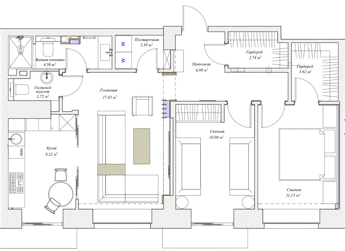 Данную квартиру наши герои приобрели недавно, чтобы наконец-то "пожить для себя". Так как квартира была не в лучшем виде, то они сразу же решили её полностью переделать под себя. Главная проблема этой квартиры - низкие потолки, всего 2,5 метра (после загородного дома, для хозяев высота потолков казалось слишком низкой). Поэтому дизайнер сразу же решил любыми средствами визуально их увеличить. Решили добавить высокие деревянные панели, большие зеркала и крупноформатный керамогранит. Проект Было решено сделать небольшую перепланировку, в ходе которой появились дополнительные две гардеробные и одна хозяйственная комната. Этого удалось достичь за счет площади коридоров. Вход на кухню теперь находился в гостиной, а жилые помещения поделили на гостиную и 2 спальни. Прихожая Владельцам очень нравятся традиционные фактуры, поэтому на пол положили паркет. Некоторую часть стен оформили крупным керамогранитом, из-за этого получилось хороший контраст теплых оттенков и холодных. Гостиная Так как