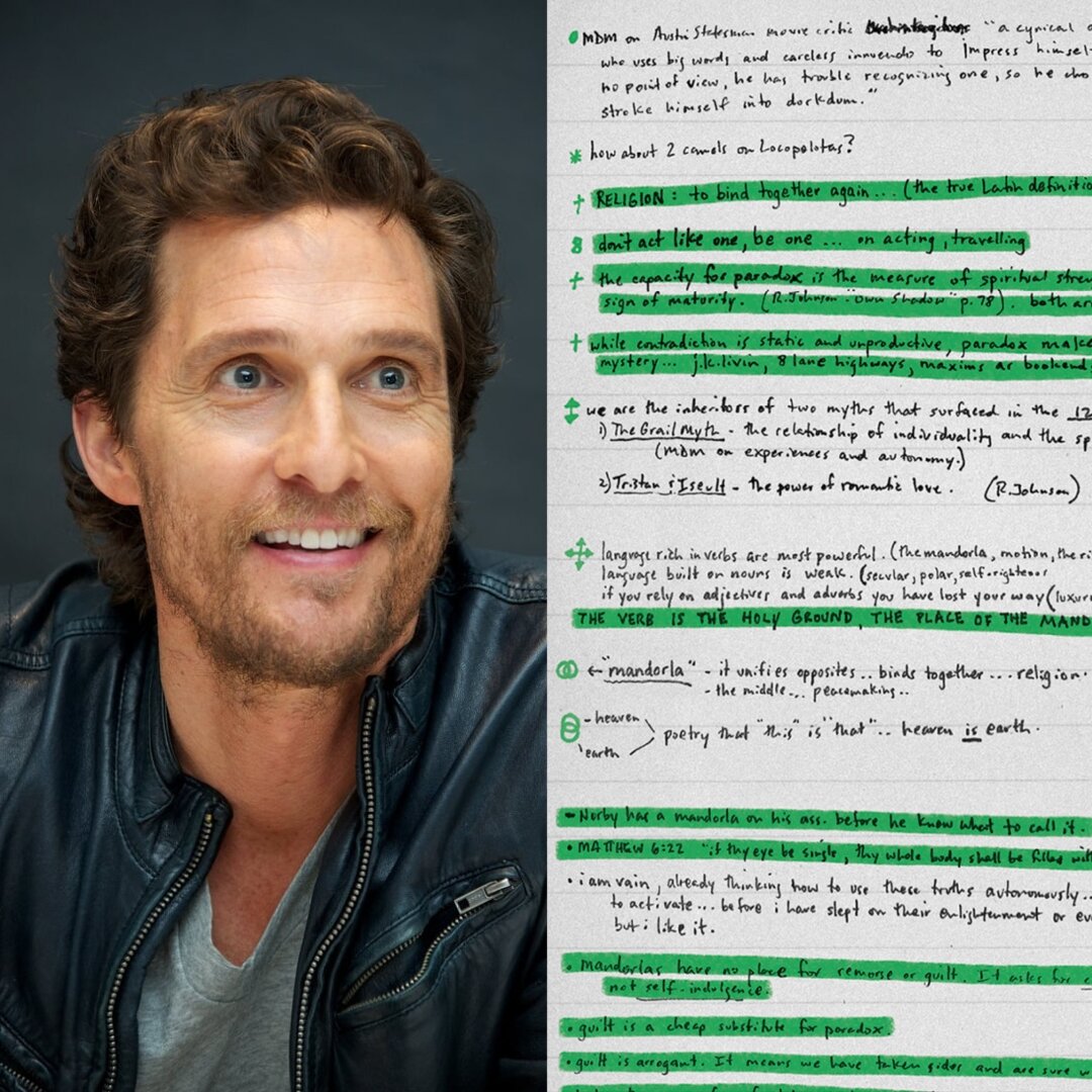 Вчера дочитал «Зеленый свет» Мэттью Макконахи. В книге описан жизненный путь актера и размышления о полученном опыте. Кроме этого, в ней есть материал для изучения графолога — образцы почерка из дневников и рукописей. Мне стало интересно сравнить образ, который я составил по книге, с информацией, которую дает почерк. Итак, Мэттью Макконахи, какой ты на самом деле?