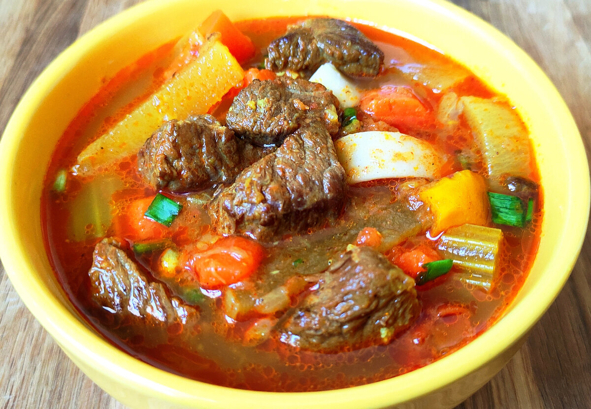 Лагман- это что-то среднее между супом и вторым блюдом. Можно сказать, это очень густой суп. С мясом, овощами, лапшой и специями. Мясо можно взять любое: баранину, свинину, говядину, птицу. Сегодня мы приготовим Лагман с говядиной. Для это нам понадобится: -Мякоть говядины 600гр -Лапша для лагмана 200гр -лук 2шт -морковь 2шт -помидоры 5шт -стебли сельдерея 4шт -перец сладкий 2шт -редька дайкон 1шт -специи: черный молотый перец 1/2ч.л, паприка 1,5 ч.л, кориандр 1/2ч.л, куркума 1ч.л, имбирь сухой 1/2ч.л, бадьян звездчатый 2шт, лавровый лист 2шт. 🍲 Приготовление: Все овощи нарезаем. Не мелко. Мякоть говядины тоже нарезаем. На растительном масле обжариваем кусочки говядины на сильном огне до образования корочки. Добавляем лук, перемешиваем, жарим 2 минуты Добавляем морковь, обжариваем 1 минуту Добавляем помидоры, жарим 1 минуту Добавляем сельдерей, редьку, жарим 1 минуту Добавляем перец, солим по вкусу (примерно 2ч.л), всыпаем все специи, перемешиваем. Заливаем водой Довод